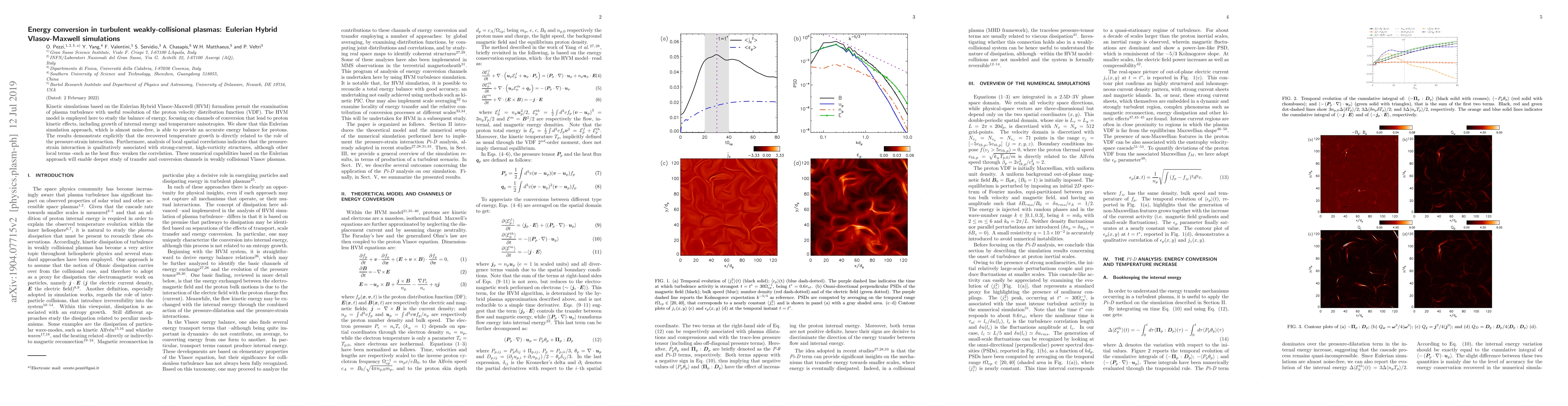 This paper uses Eulerian Hybrid Vlasov-Maxwell simulations to study energy conversion in turbulent weakly-collisional plasmas, focusing on proton kinetic effects and temperature anisotropies. The results show that pressure-strain interactions are key to the growth of internal energy and are linked to high-vorticity structures.