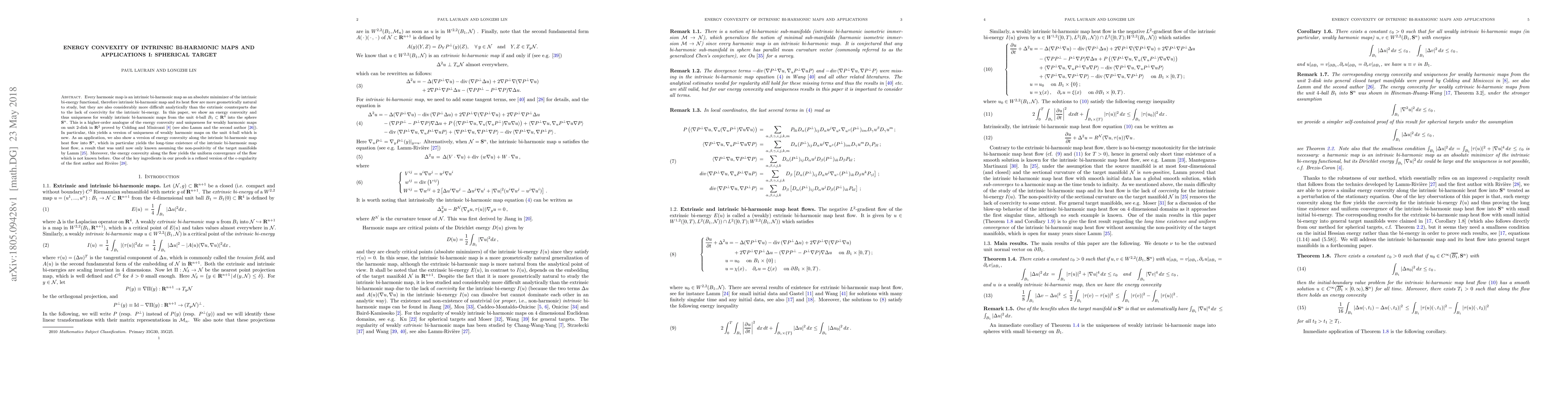 Every harmonic map is an intrinsic bi-harmonic map as an absolute minimizer of the intrinsic bi-energy functional, therefore intrinsic bi-harmonic map and its heat flow are more geometrically natural to study, but they are also considerably more difficult analytically than the extrinsic counterparts due to the lack of coercivity for the intrinsic bi-energy. In this paper, we show an energy convexity and thus uniqueness for weakly intrinsic bi-harmonic maps from the unit $4$-ball $B_1 \subset \mathbf{R}^4$ into the sphere $\mathbf{S}^n$. This is a higher-order analogue of the energy convexity and uniqueness for weakly harmonic maps on unit $2$-disk in $\mathbf{R}^2$ proved by Colding and Minicozzi \cite{CM08} (see also Lamm and the second author \cite{LL13}). In particular, this yields a version of uniqueness of weakly harmonic maps on the unit $4$-ball which is new. As an application, we also show a version of energy convexity along the intrinsic bi-harmonic map heat flow into $\mathbf{S}^n$, which in particular yields the long-time existence of the intrinsic bi-harmonic map heat flow, a result that was until now only known assuming the non-positivity of the target manifolds by Lamm \cite{Lamm05}. Moreover, the energy convexity along the flow yields the uniform convergence of the flow which is not known before. One of the key ingredients in our proofs is a refined version of the $\epsilon$-regularity of the first author and Rivi\`{e}re \cite{LaR}.