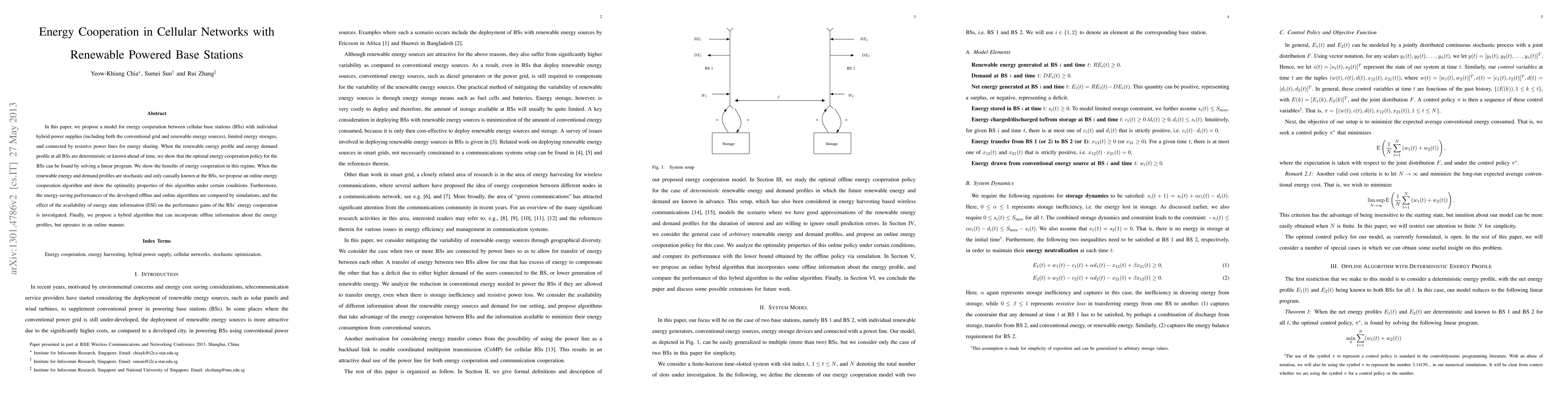 This paper proposes models for energy cooperation among cellular base stations powered by hybrid sources, including renewable energy. It presents optimal linear programming solutions for deterministic energy profiles and an online algorithm for stochastic profiles, comparing both offline and online strategies through simulations to assess energy-saving benefits and the impact of energy state information availability.