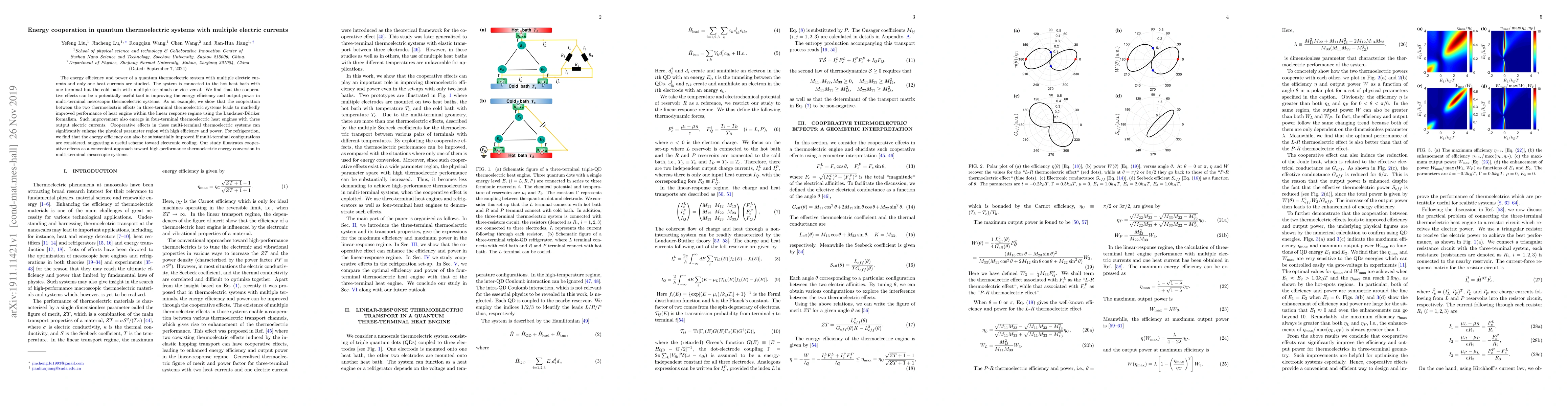 This paper investigates quantum thermoelectric systems with multiple electric currents, finding that cooperative effects can significantly enhance energy efficiency and output power in multi-terminal mesoscopic systems. The study demonstrates improved performance in both three-terminal heat engines and four-terminal thermoelectric heat engines, suggesting a promising approach for high-performance thermoelectric energy conversion.