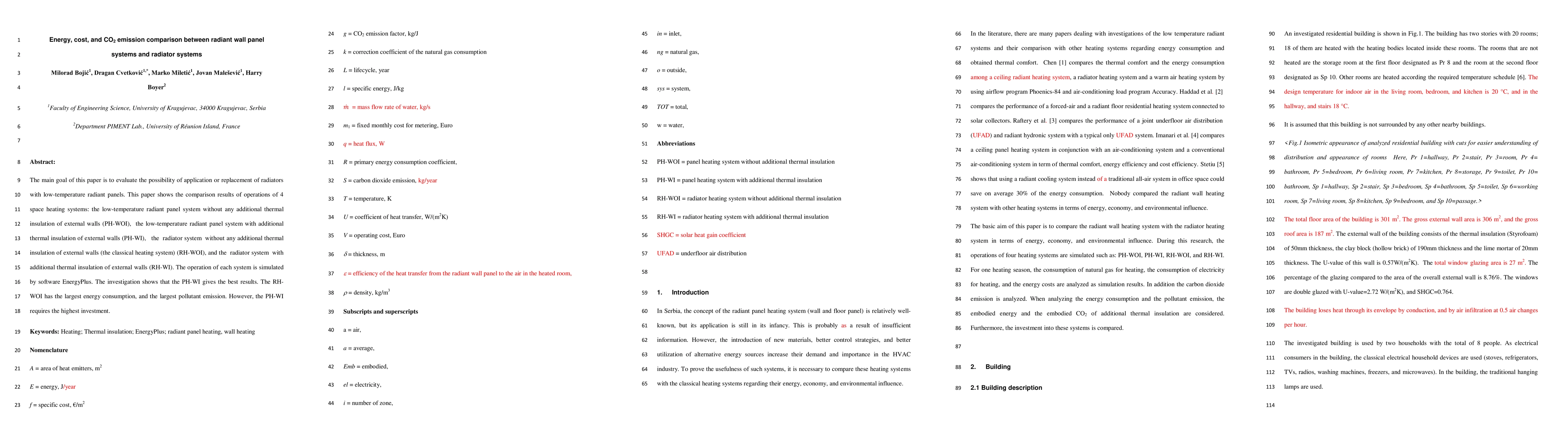 The main goal of this paper is to evaluate the possibility of application or replacement of radiators with low-temperature radiant panels. This paper shows the comparison results of operations of 4 space heating systems: the low-temperature radiant panel system without any additional thermal insulation of external walls (PH-WOI), the low-temperature radiant panel system with additional thermal insulation of external walls (PH-WI), the radiator system without any additional thermal insulation of external walls (the classical heating system) (RH-WOI), and the radiator system with additional thermal insulation of external walls (RH-WI). The operation of each system is simulated by software EnergyPlus. The investigation shows that the PH-WI gives the best results. The RH-WOI has the largest energy consumption, and the largest pollutant emission. However, the PH-WI requires the highest investment.