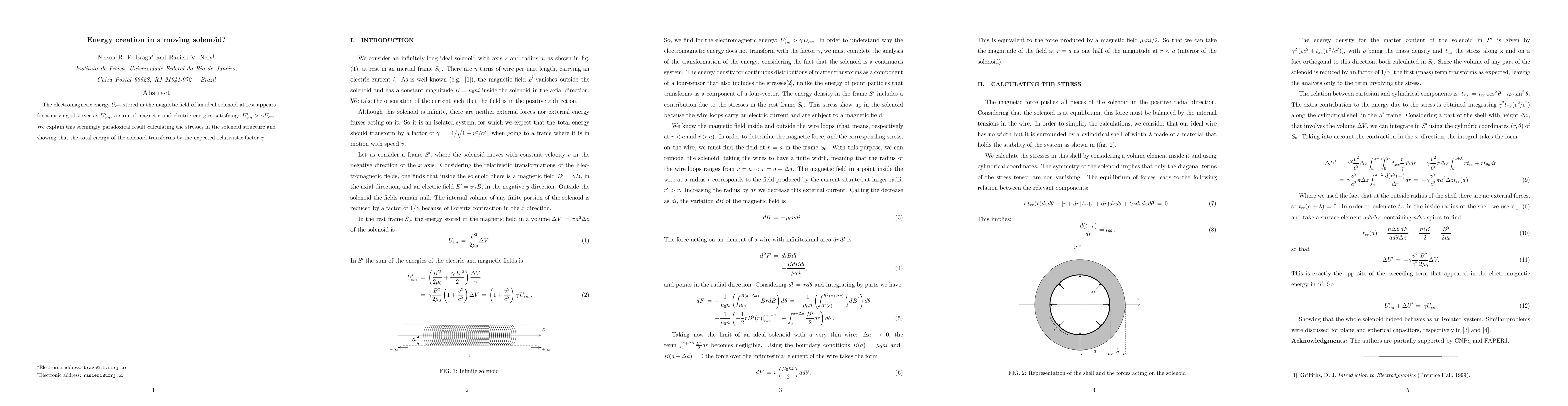 The electromagnetic energy $U_{em}$ stored in the magnetic field of an ideal solenoid at rest appears for a moving observer as $U'_{em} $, a sum of magnetic and electric energies satisfying: $U'_{em} > \gamma U_{em}$. We explain this seemingly paradoxical result calculating the stresses in the solenoid structure and showing that the total energy of the solenoid transforms by the expected relativistic factor $\gamma$.