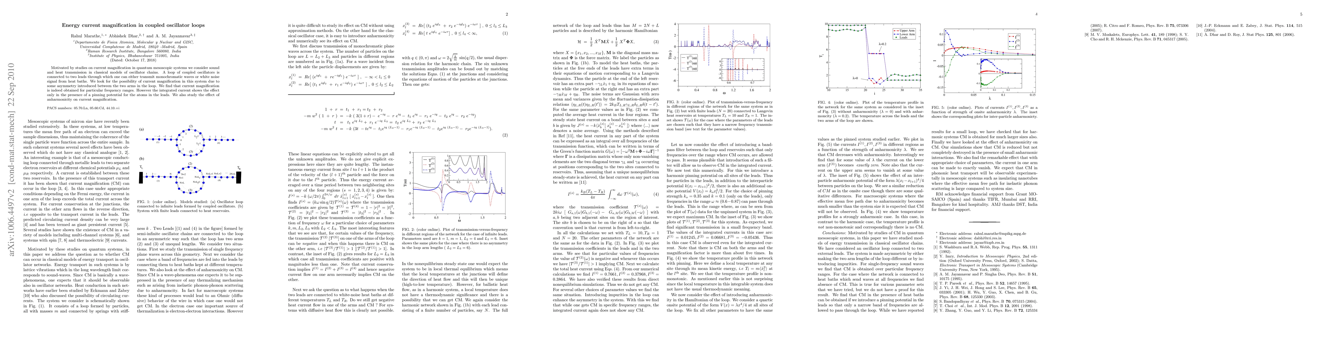 This paper investigates current magnification in coupled oscillator loops connected to leads transmitting sound or heat. It finds that current magnification occurs under specific frequency ranges and in the presence of a pinning potential, with anharmonicity also influencing the effect.