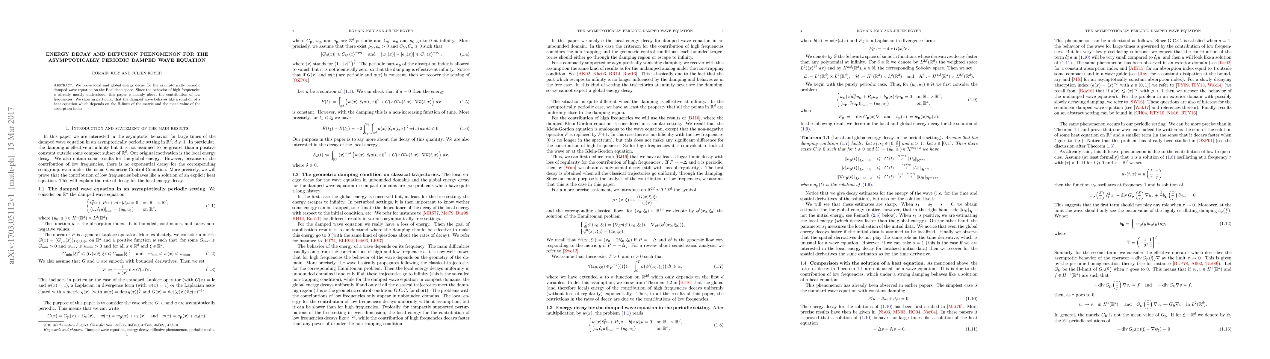 This paper proves local and global energy decay for the asymptotically periodic damped wave equation, focusing on the contribution of low frequencies, and demonstrates that the damped wave behaves like a solution of a heat equation influenced by the H-limit of the metric and the mean absorption index.