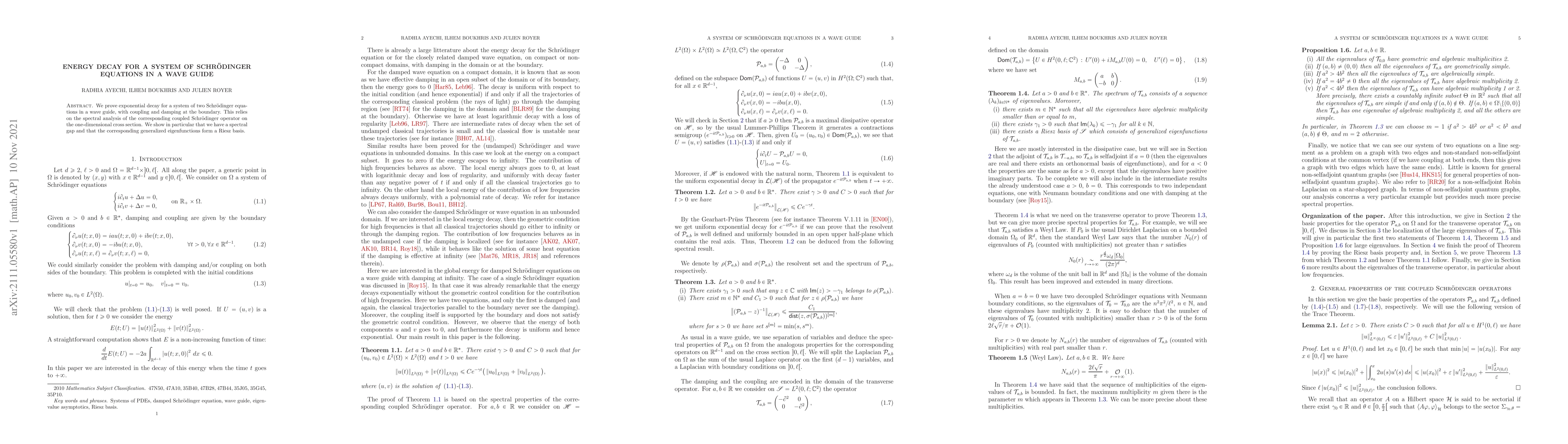 We prove exponential decay for a system of two Schr{\"o}dinger equations in a wave guide, with coupling and damping at the boundary. This relies on the spectral analysis of the corresponding coupled Schr{\"o}dinger operator on the one-dimensional cross section. We show in particular that we have a spectral gap and that the corresponding generalized eigenfunctions form a Riesz basis.