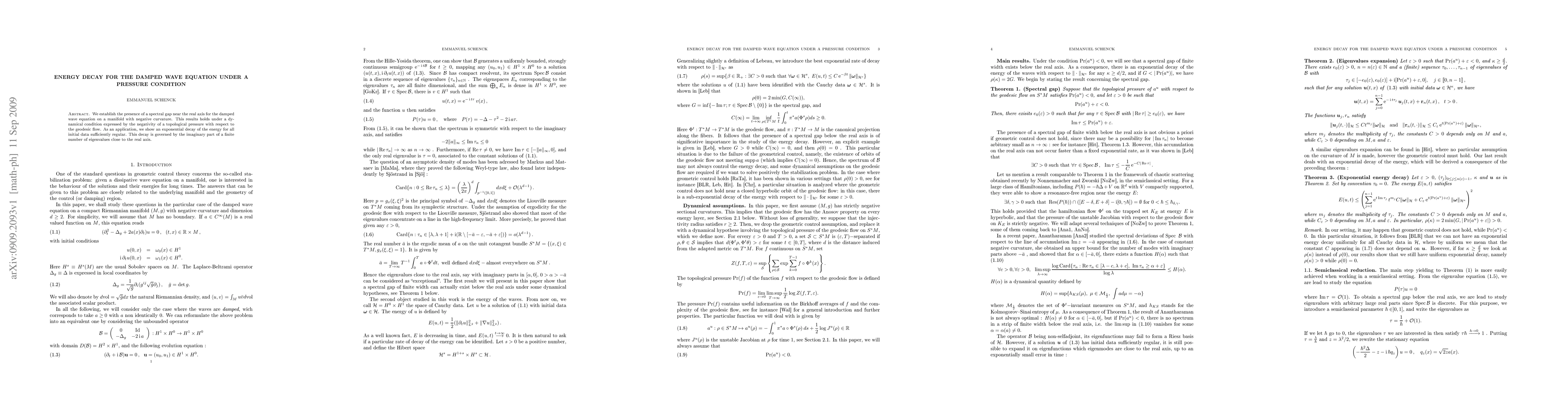 We establish the presence of a spectral gap near the real axis for the damped wave equation on a manifold with negative curvature. This results holds under a dynamical condition expressed by the negativity of a topological pressure with respect to the geodesic flow. As an application, we show an exponential decay of the energy for all initial data sufficiently regular. This decay is governed by the imaginary part of a finite number of eigenvalues close to the real axis.