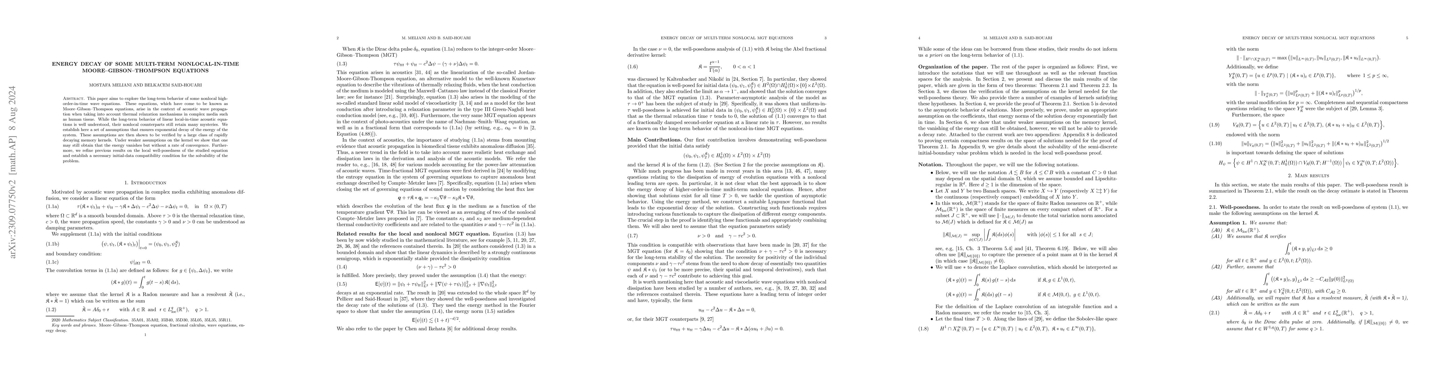This paper aims at exploring the long-term behavior of some nonlocal high-order-in-time wave equations. These equations, which have come to be known as Moore--Gibson--Thompson equations, arise in the context of acoustic wave propagation when taking into account thermal relaxation mechanisms in complex media such as human tissue. While the long-term behavior of linear local-in-time acoustic equations is well understood, their nonlocal counterparts still retain many mysteries in that regard. We establish here a set of assumptions which ensures exponential decay of the energy of the system. These assumptions are then shown to be verified by a large class of rapidly decaying memory kernels. Under weaker assumptions on the kernel we show that one may still obtain that the energy vanishes but without a rate of convergence. We furthermore refine previous results on the local well-posedness of the studied equation and establish a necessary initial-data compatibility condition for the solvability of the problem.