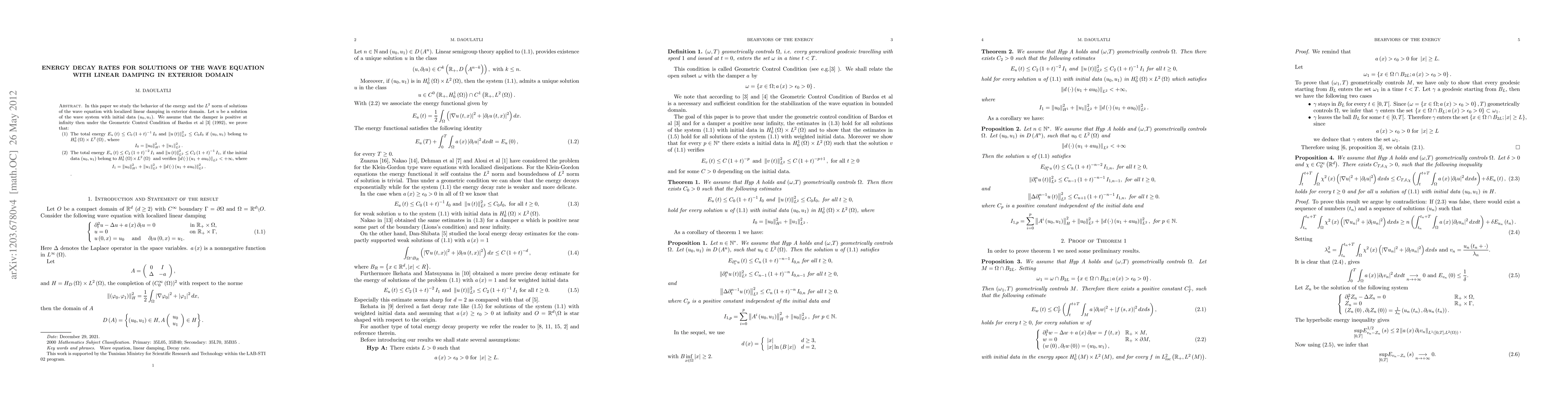 This paper investigates the energy decay rates for solutions of the wave equation with linear damping in an exterior domain. Under the Geometric Control Condition, it proves that total energy decays as O(1/t) with bounded L^2-norm for specific initial data, and for weighted initial data, energy decays as O(1/t^2) while L^2-norm decays as O(1/t).