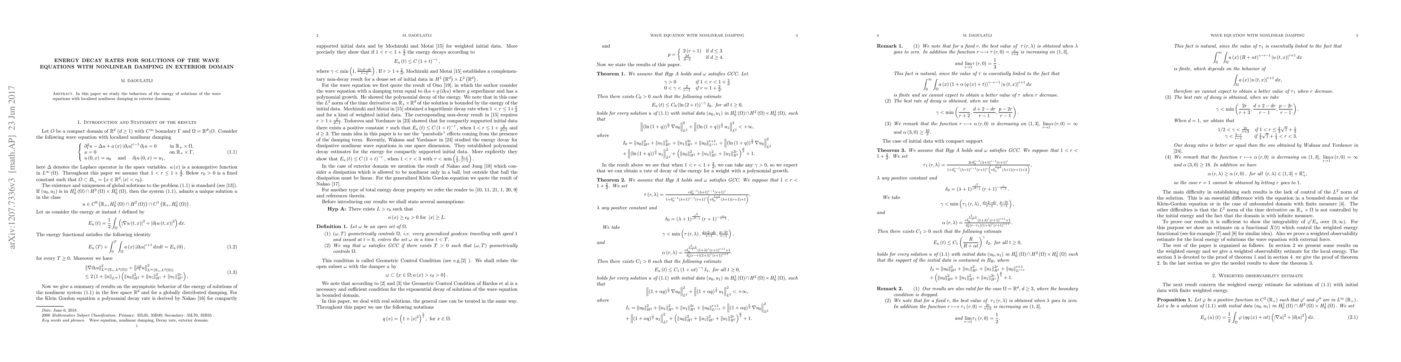 Summary: This paper investigates the energy decay rates of solutions to wave equations featuring localized nonlinear damping in exterior domains, focusing on the behavior and decay characteristics of the energy.