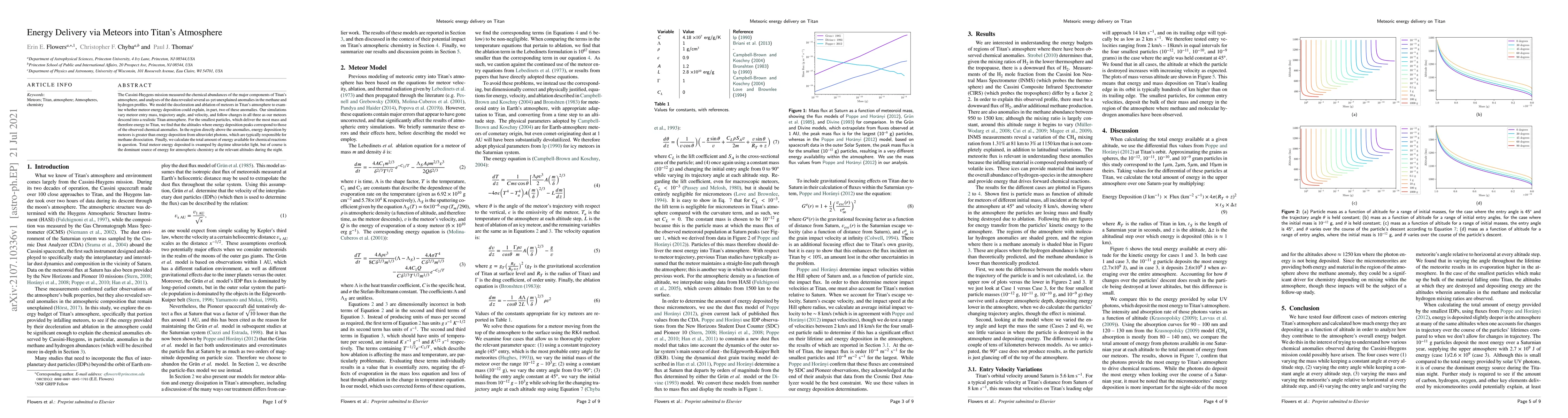 The Cassini-Huygens mission measured the chemical abundances of the major components of Titan's atmosphere, and analyses of the data revealed several as-yet unexplained anomalies in the methane and hydrogen profiles. We model the deceleration and ablation of meteors in Titan's atmosphere to examine whether meteor energy deposition could explain, in part, two of these anomalies. Our simulations vary meteor entry mass, trajectory angle, and velocity, and follow changes in all three as our meteors descend into a realistic Titan atmosphere. For the smallest particles, which deliver the most mass and therefore energy to Titan, we find that the altitudes where energy deposition peaks correspond to those of the observed chemical anomalies. In the region directly above the anomalies, energy deposition by meteors is greater than energy deposition from ultraviolet photons, which are typically responsible for methane dissociation. Finally, we calculate the total amount of energy available for chemical reactions in question. Total meteor energy deposited is swamped by daytime ultraviolet light, but of course is the dominant source of energy for atmospheric chemistry at the relevant altitudes during the night.