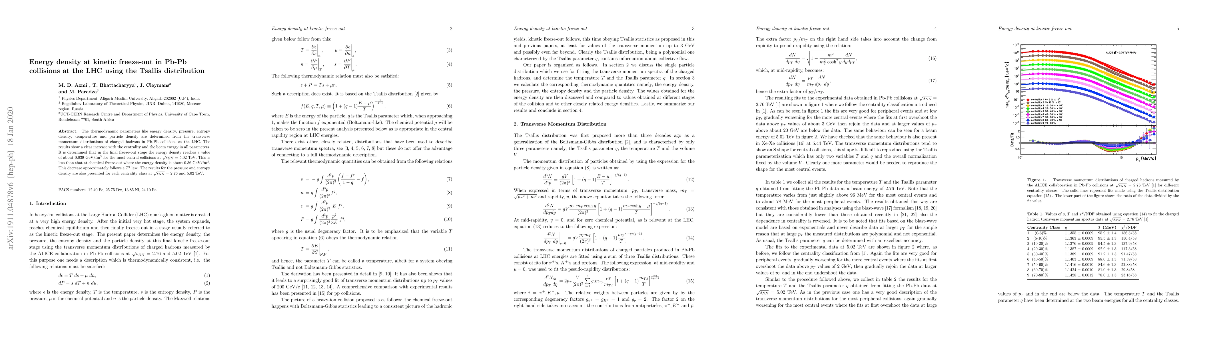 This study uses the Tsallis distribution to determine thermodynamic parameters from Pb-Pb collision data at the LHC, finding that energy density at kinetic freeze-out is about 0.039 GeV/fm$^3$ for the most central collisions at 5.02 TeV, significantly lower than the chemical freeze-out value of 0.36 GeV/fm$^3$. The results show a $T^4$ law for the decrease in energy density.
