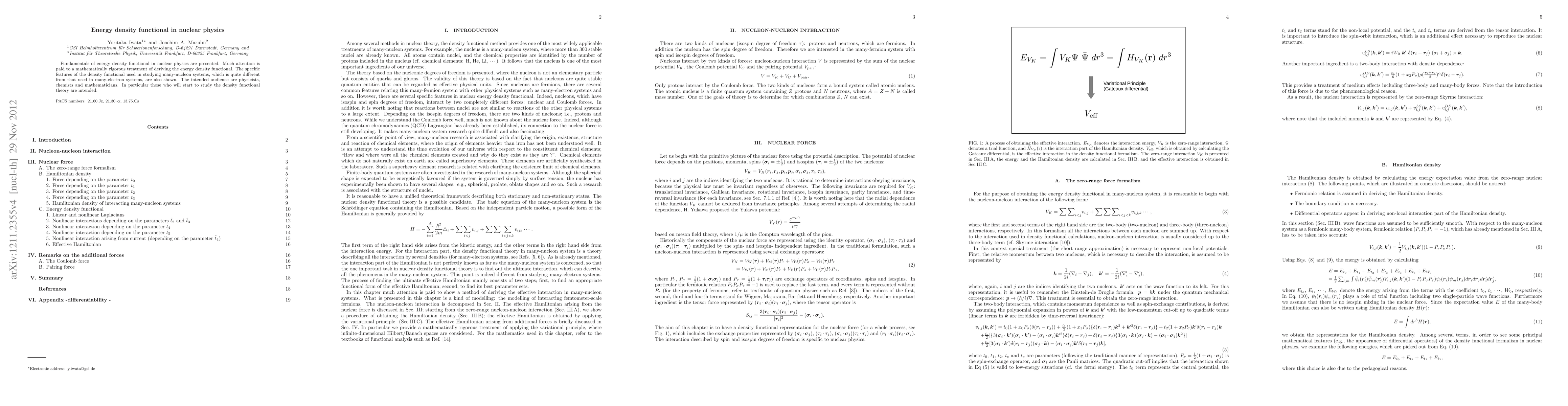 Fundamentals of energy density functional in nuclear physics are presented. Much attention is paid to a mathematically rigorous treatment of deriving the energy density functional. The specific features of the density functional used in studying many-nucleon systems, which is quite different from that used in many-electron systems, are also shown. The intended audience are physicists, chemists and mathematicians. In particular those who will start to study the density functional theory are intended.