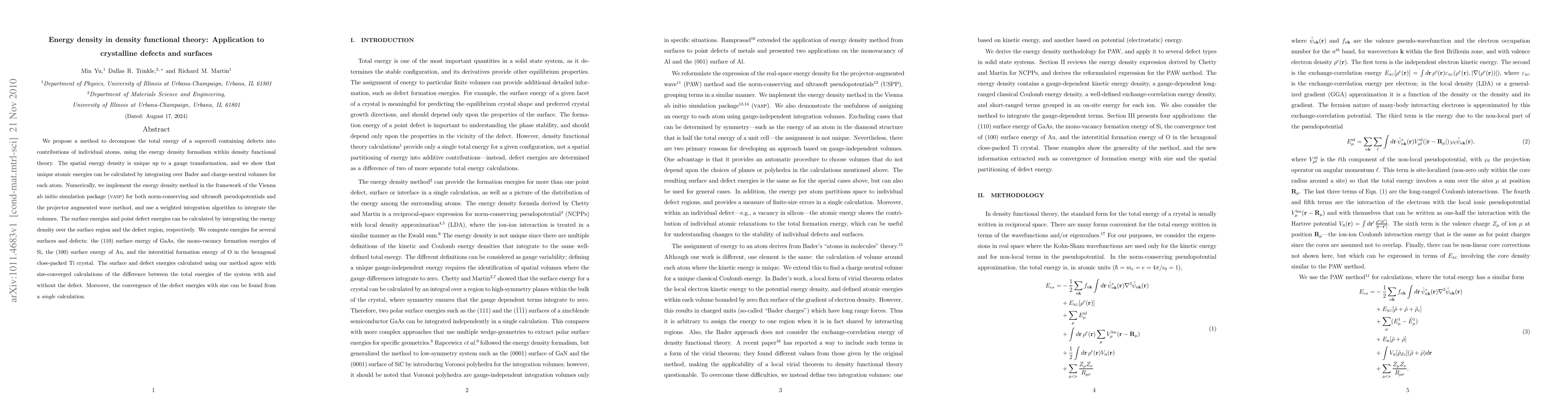 This paper proposes a method to decompose the total energy of supercells with defects using energy density formalism within density functional theory, showing agreement with size-converged calculations for various surfaces and defects. The method is implemented in VASP and calculates unique atomic energies by integrating over Bader volumes.