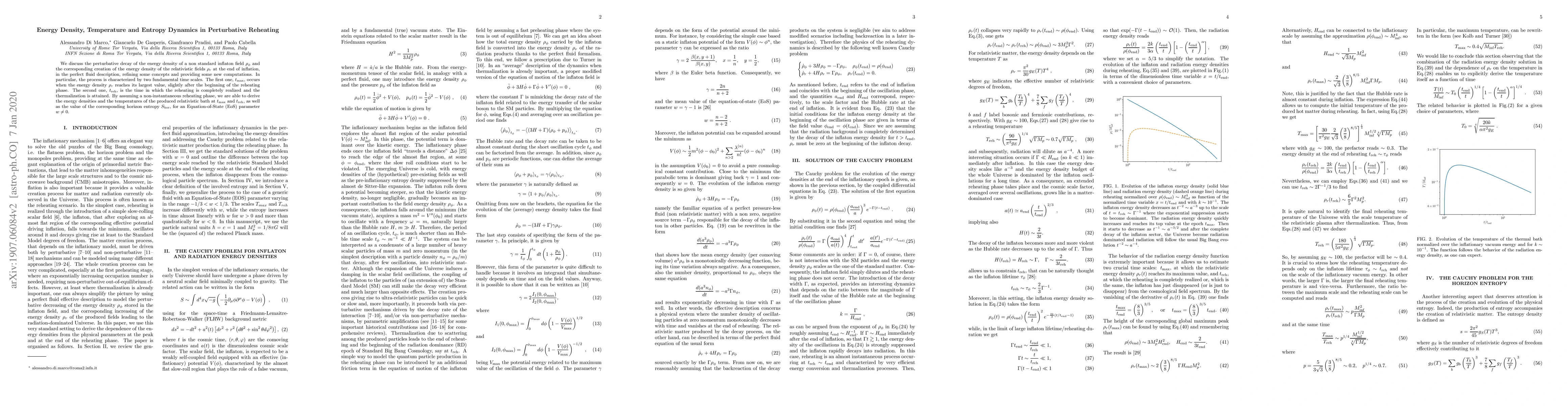 We discuss the perturbative decay of the energy density of a non standard inflaton field $\rho_{\phi}$ and the corresponding creation of the energy density of the relativistic fields $\rho_r$ at the end of inflation, in the perfect fluid description, refining some concepts and providing some new computations. In particular, the process is characterized by two fundamental time scales. The first one, $t_\text{max}$, occurs when the energy density $\rho_r$ reaches its largest value, slightly after the beginning of the reheating phase. The second one, $t_\text{reh}$, is the time in which the reheating is completely realized and the thermalization is attained. By assuming a non-instantaneous reheating phase, we are able to derive the energy densities and the temperatures of the produced relativistic bath at $t_\text{max}$ and $t_\text{reh}$, as well as the value of the corresponding horizon entropy $S_\text{hor}$, for an Equation-of-State (EoS) parameter $w\ne 0$.