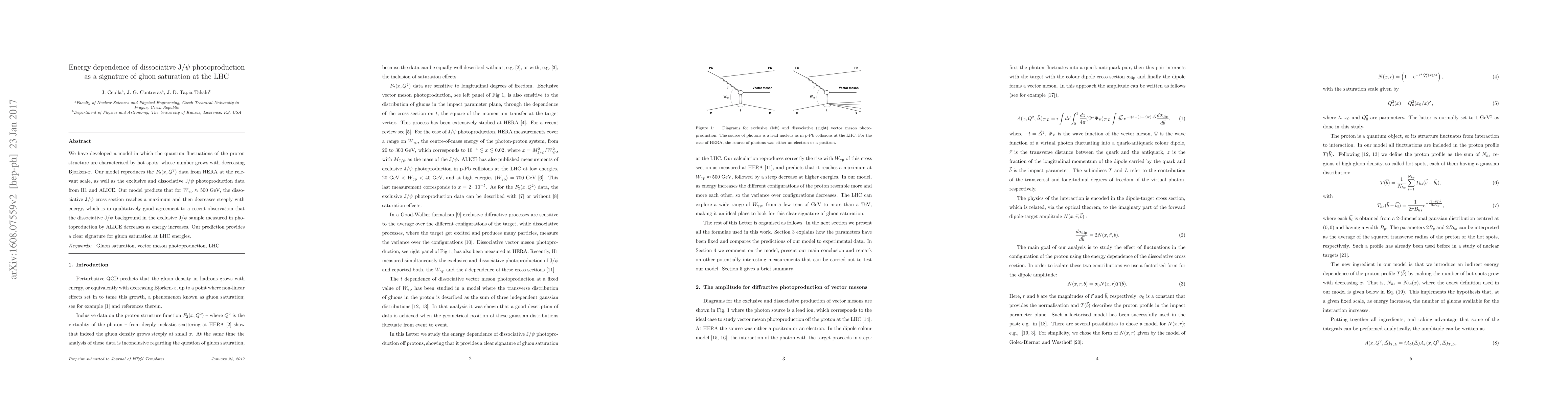 We have developed a model in which the quantum fluctuations of the proton structure are characterised by hot spots, whose number grows with decreasing Bjorken-$x$. Our model reproduces the $F_2(x,Q^2)$ data from HERA at the relevant scale, as well as the exclusive and dissociative $\mathrm{J/}\psi$ photoproduction data from H1 and ALICE. Our model predicts that for $W_{\gamma\mathrm{p}} \approx 500$ GeV, the dissociative $\mathrm{J/}\psi$ cross section reaches a maximum and then decreases steeply with energy, which is in qualitatively good agreement to a recent observation that the dissociative $\mathrm{J/}\psi$ background in the exclusive $\mathrm{J/}\psi$ sample measured in photoproduction by ALICE decreases as energy increases. Our prediction provides a clear signature for gluon saturation at LHC energies.