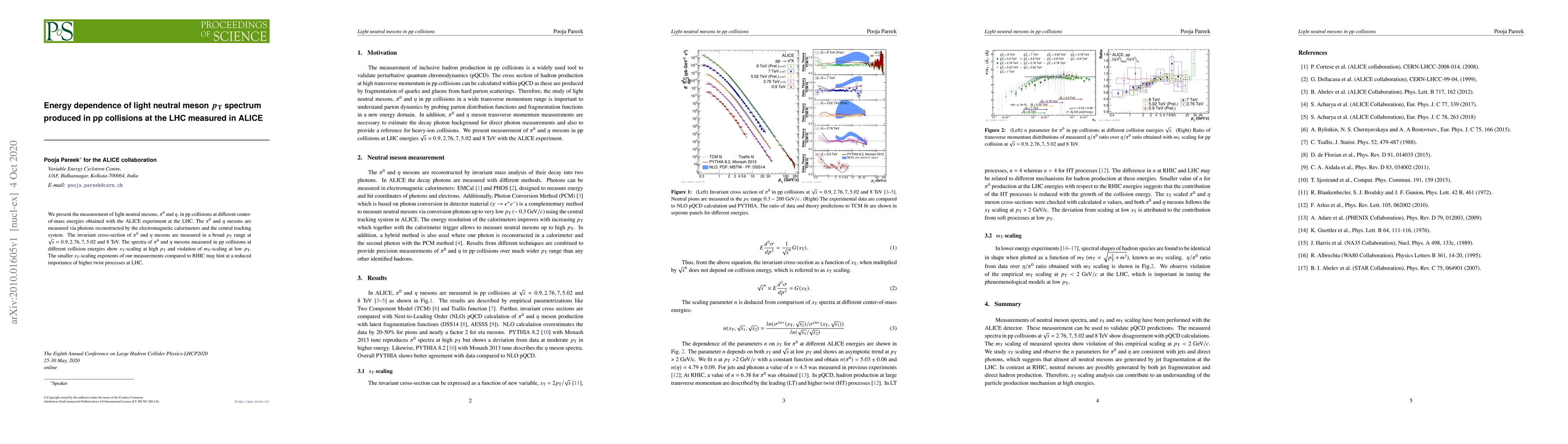 We present the measurement of light neutral mesons, $\pi^{0}$ and $\eta$, in pp collisions at different center-of-mass energies obtained with the ALICE experiment at the LHC. The $\pi^{0}$ and $\eta$ mesons are measured via photons reconstructed by the electromagnetic calorimeters and the central tracking system. The invariant cross-section of $\pi^{0}$ and $\eta$ mesons are measured in a broad $p_{\rm T}$ range at $\sqrt{s} = 0.9, 2.76, 7, 5.02$ and 8 TeV. The spectra of $\pi^{0}$ and $\eta$ mesons measured in pp collisions at different collision energies show $x_{\rm T}$-scaling at high $p_{\rm T}$ and violation of $m_{\rm T}$-scaling at low $p_{\rm T}$. The smaller $x_{\rm T}$-scaling exponents of our measurements compared to RHIC may hint at a reduced importance of higher twist processes at LHC.