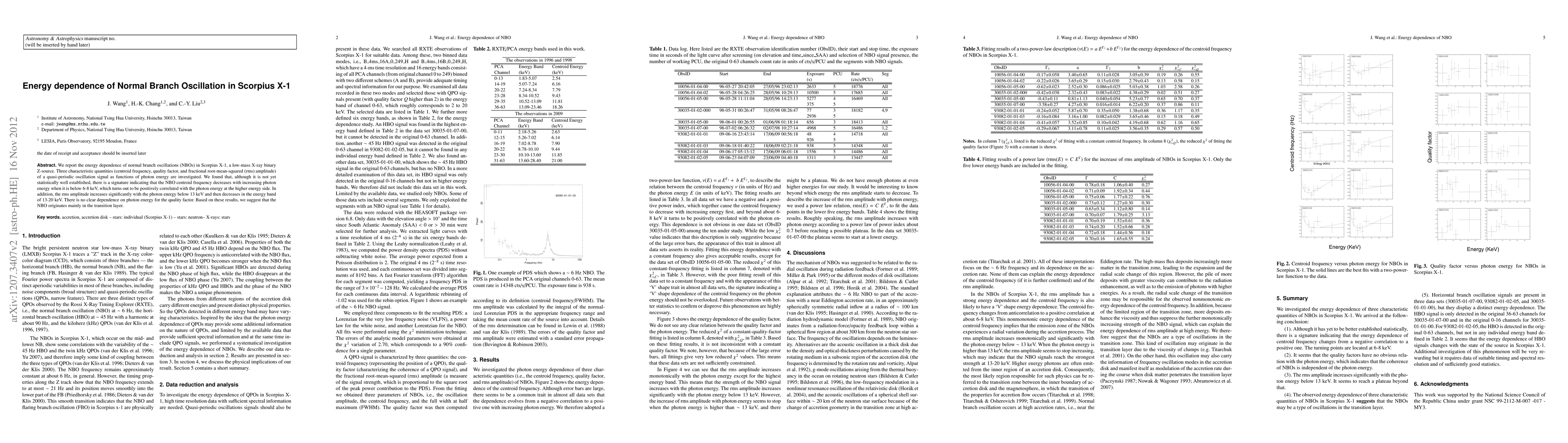 We report the energy dependence of normal branch oscillations (NBOs) in Scorpius X-1, a low-mass X-ray binary Z-source. Three characteristic quantities (centroid frequency, quality factor, and fractional root-mean-squared (rms) amplitude) of a quasi-periodic oscillation signal as functions of photon energy are investigated. We found that, although it is not yet statistically well established, there is a signature indicating that the NBO centroid frequency decreases with increasing photon energy when it is below 6-8 keV, which turns out to be positively correlated with the photon energy at the higher energy side. In addition, the rms amplitude increases significantly with the photon energy below 13 keV and then decreases in the energy band of 13-20 keV. There is no clear dependence on photon energy for the quality factor. Based on these results, we suggest that the NBO originates mainly in the transition layer.