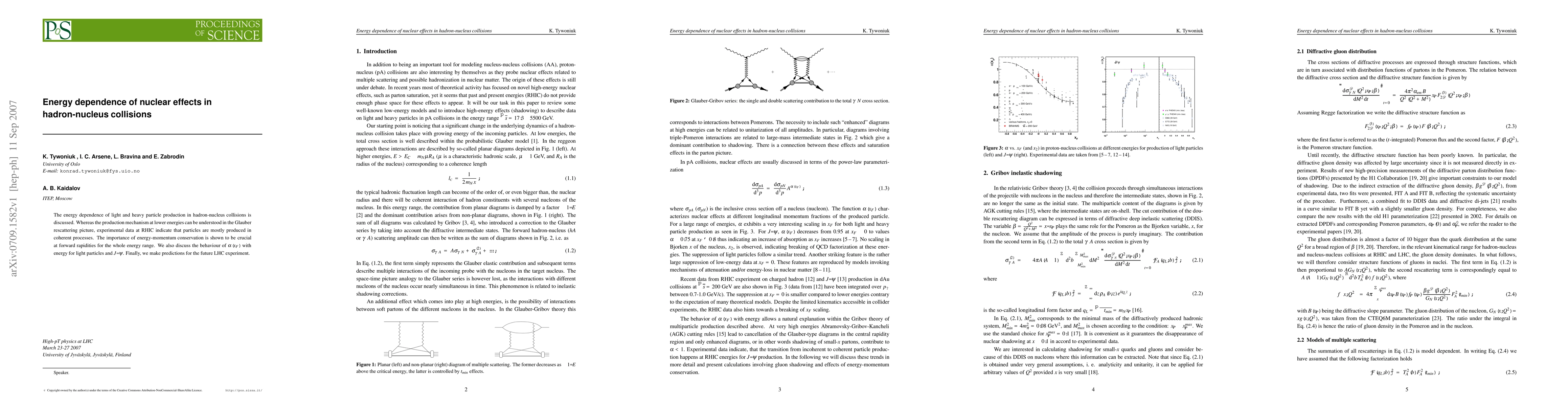 The energy dependence of light and heavy particle production in hadron-nucleus collisions is discussed. Whereas the production mechanism at lower energies can be understood in the Glauber rescattering picture, experimental data at RHIC indicate that particles are mostly produced in coherent processes. The importance of energy-momentum conservation is shown to be crucial at forward rapidities for the whole energy range. We also discuss the behaviour of $\alpha (x_F)$ with energy for light particles and $J/\psi$. Finally, we make predictions for the future LHC experiment.