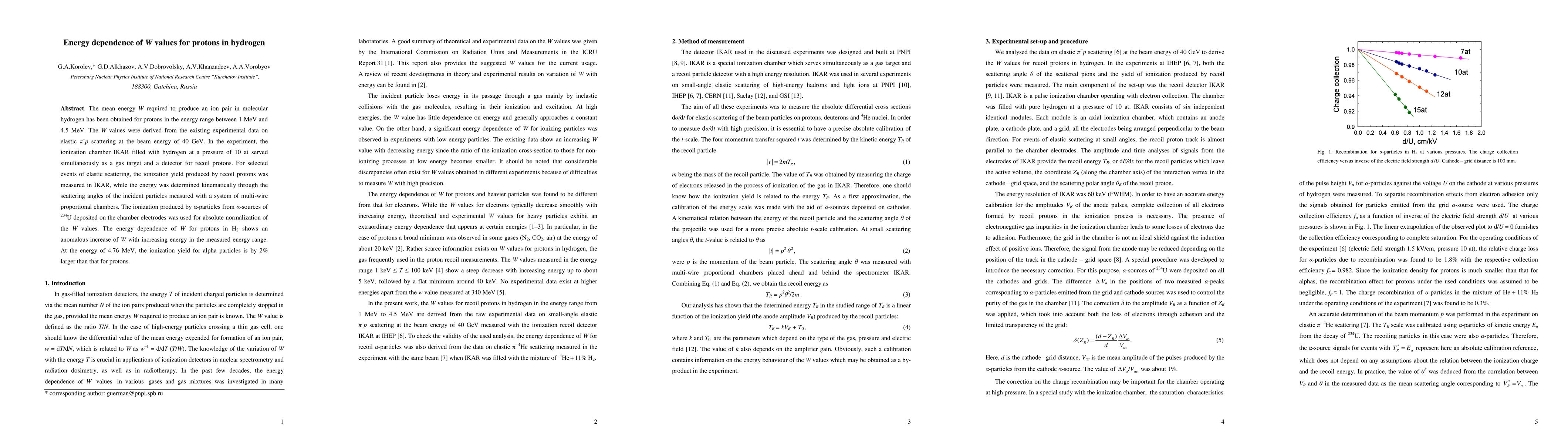 The mean energy $W$ required to produce an ion pair in molecular hydrogen has been obtained for protons in the energy range between 1 MeV and 4.5 MeV. The W values were derived from the existing experimental data on elastic {\it $\pi^-$p} scattering at the beam energy of 40 GeV. In the experiment, the ionization chamber IKAR filled with hydrogen at a pressure of 10 at served simultaneously as a gas target and a detector for recoil protons. For selected events of elastic scattering, the ionization yield produced by recoil protons was measured in IKAR, while the energy was determined kinematically through the scattering angles of the incident particles measured with a system of multi-wire proportional chambers. The ionization produced by $\alpha$-particles from $\alpha$-sources of $^{234}$U deposited on the chamber electrodes was used for absolute normalization of the W values. The energy dependence of $W$ for protons in H$_2$ shows an anomalous increase of $W$ with increasing energy in the measured energy range. At the energy of 4.76 MeV, the ionization yield for alpha particles is by 2\% larger than that for protons.