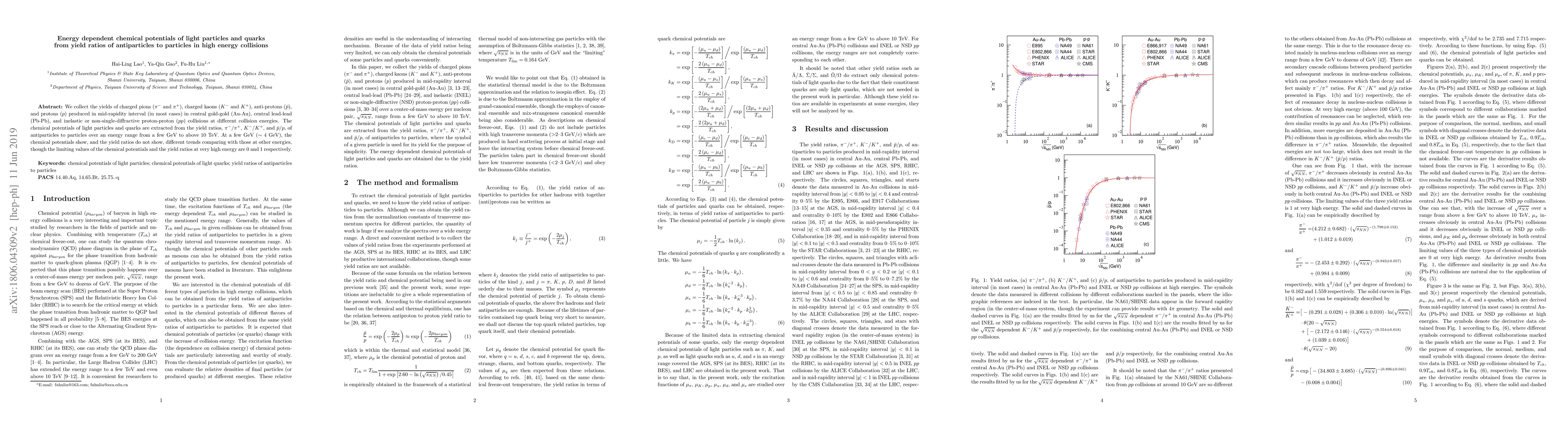 This study analyzes the yields of various antiparticles and particles in high-energy collisions to extract energy-dependent chemical potentials of light particles and quarks. The yield ratios of antiparticles to particles show distinct trends at low energies compared to higher energies, indicating a transition in the behavior of chemical potentials.