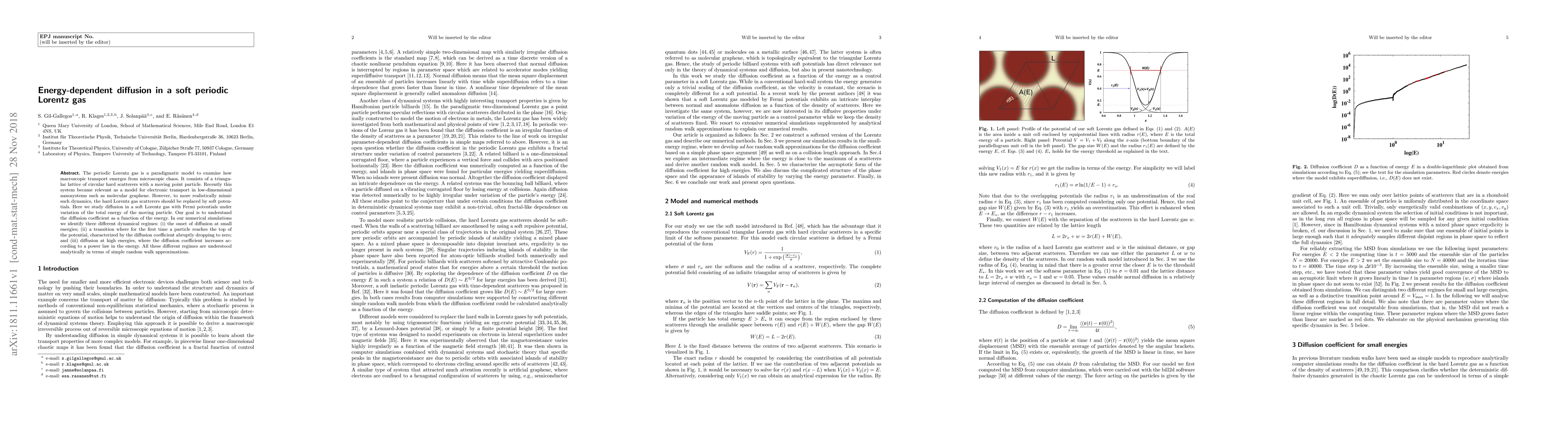 This paper investigates the diffusion behavior in a soft periodic Lorentz gas with Fermi potentials, identifying three distinct energy-dependent dynamical regimes: onset of diffusion at low energies, a transition where diffusion ceases, and high-energy diffusion following a power law. Analytical models explain these regimes through simple random walk approximations.