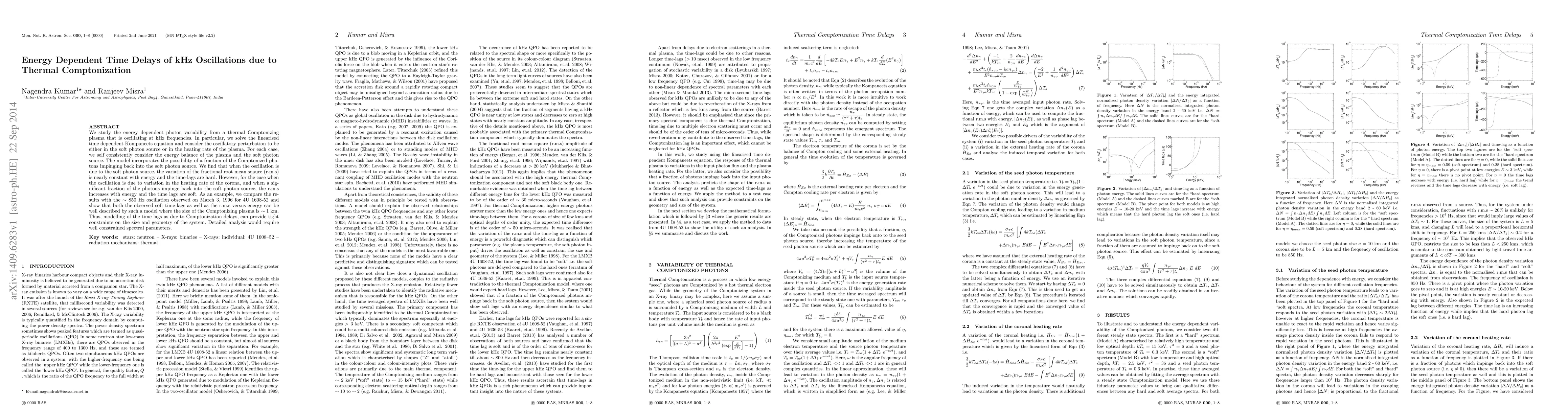 We study the energy dependent photon variability from a thermal Comptonizing plasma that is oscillating at kHz frequencies. In particular, we solve the linearised time dependent Kompaneets equation and consider the oscillatory perturbation to be either in the soft photon source or in the heating rate of the plasma. For each case, we self consistently consider the energy balance of the plasma and the soft photon source. The model incorporates the possibility of a fraction of the Comptonized photons impinging back into the soft photon source. We find that when the oscillation is due to the soft photon source, the variation of the fractional root mean sqaure (r.m.s) is nearly constant with energy and the time-lags are hard. However, for the case when the oscillation is due to variation in the heating rate of the corona, and when a significant fraction of the photons impinge back into the soft photon source, the r.m.s increases with energy and the time lags are soft. As an example, we compare the results with the $\sim 850$ Hz oscillation observed on March 3, 1996 for 4U 1608-52 and show that both the observed soft time-lags as well as the r.m.s versus energy can be well described by such a model where the size of the Comptonizing plasma is $\sim 1$ km. Thus, modelling of the time lags as due to Comptonization delays, can provide tight constraints on the size and geometry of the system. Detailed analysis would require well constrained spectral parameters.