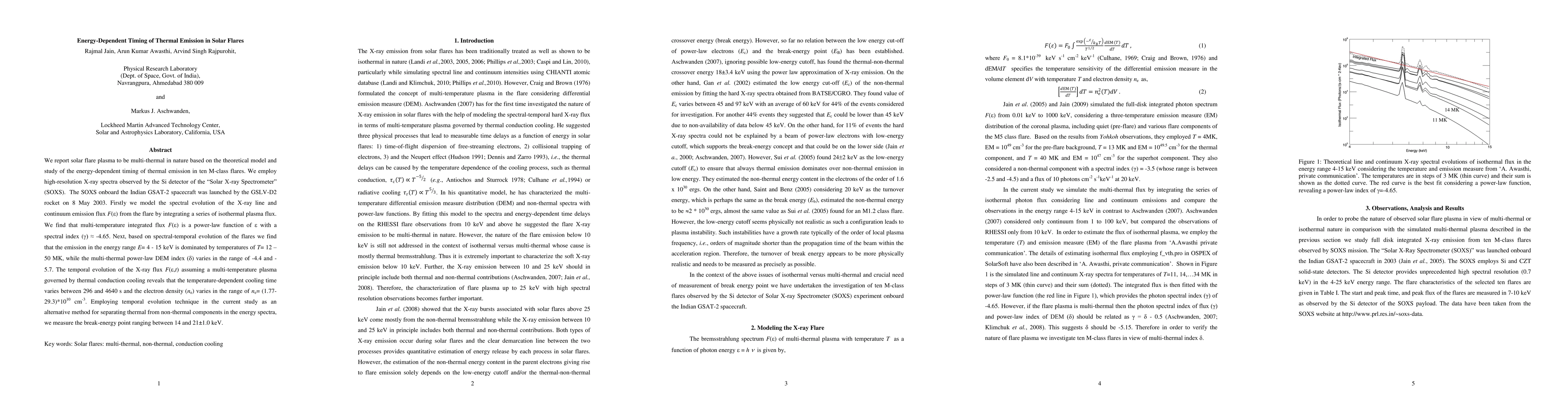 We report solar flare plasma to be multi-thermal in nature based on the theoretical model and study of the energy-dependent timing of thermal emission in ten M-class flares. We employ high-resolution X-ray spectra observed by the Si detector of the "Solar X-ray Spectrometer" (SOXS). The SOXS onboard the Indian GSAT-2 spacecraft was launched by the GSLV-D2 rocket on 8 May 2003. Firstly we model the spectral evolution of the X-ray line and continuum emission flux F(\epsilon) from the flare by integrating a series of isothermal plasma flux. We find that multi-temperature integrated flux F(\epsilon) is a power-law function of \epsilon with a spectral index (\gamma) \approx -4.65. Next, based on spectral-temporal evolution of the flares we find that the emission in the energy range E= 4 - 15 keV is dominated by temperatures of T= 12 - 50 MK, while the multi-thermal power-law DEM index (\gamma) varies in the range of -4.4 and -5.7. The temporal evolution of the X-ray flux F(\epsilon,t) assuming a multi-temperature plasma governed by thermal conduction cooling reveals that the temperature-dependent cooling time varies between 296 and 4640 s and the electron density (n_e) varies in the range of n_e= (1.77-29.3)*10^10 cm-3. Employing temporal evolution technique in the current study as an alternative method for separating thermal from non-thermal components in the energy spectra, we measure the break-energy point ranging between 14 and 21\pm1.0 keV.