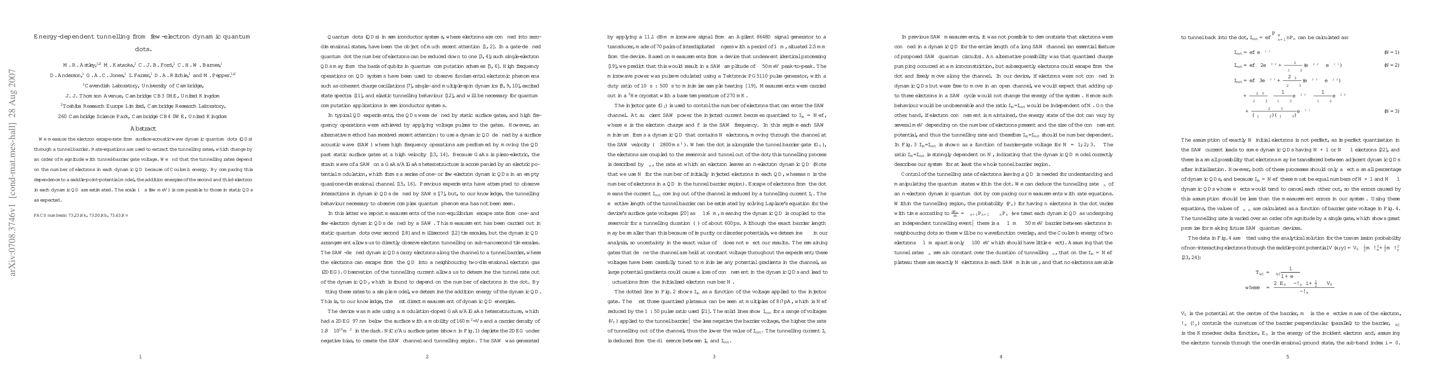 This paper measures electron escape rates from dynamic quantum dots via tunnelling, finding significant changes in rates with gate voltage. The study reveals that tunnelling rates depend on the number of electrons due to Coulomb energy, allowing estimation of addition energies for the second and third electrons.