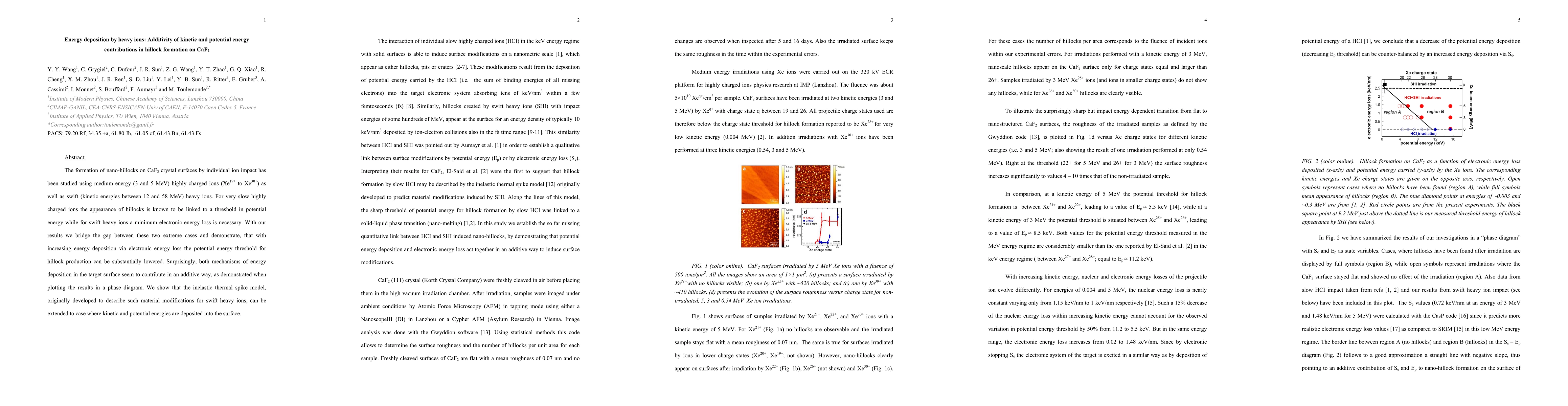 This paper investigates the formation of nano-hillocks on CaF2 surfaces via ion impact, demonstrating that both kinetic and potential energy contributions additively affect hillock formation, bridging the gap between slow and swift ion interactions. The inelastic thermal spike model is extended to include both energy types.