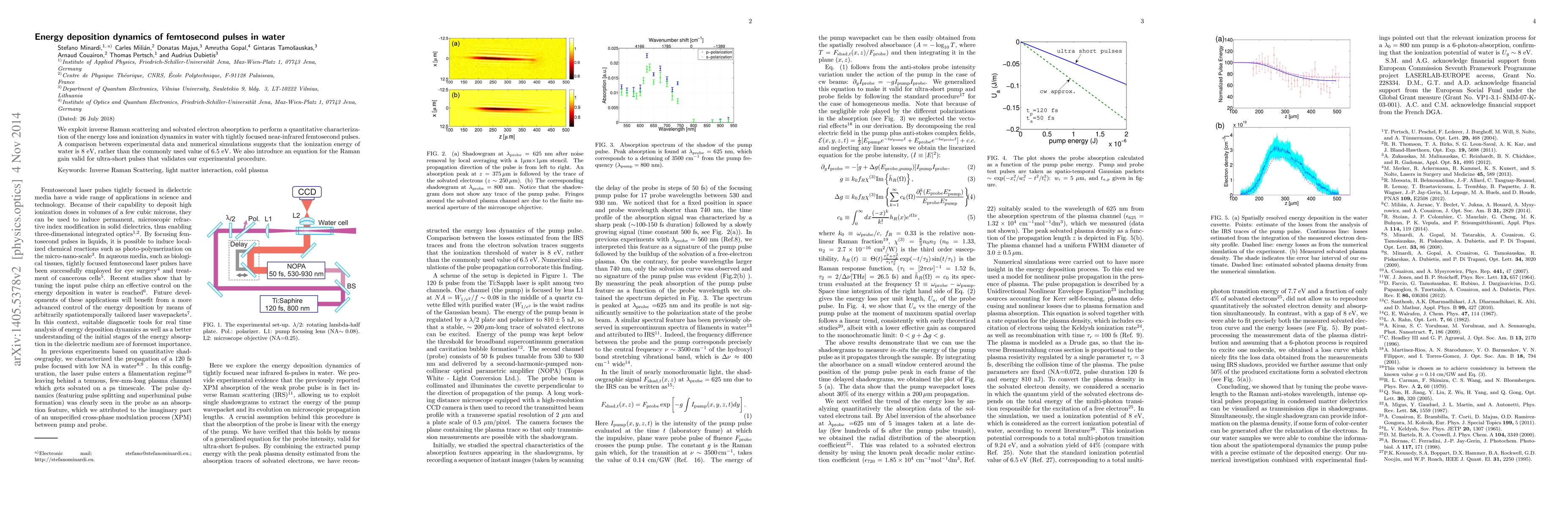 We exploit inverse Raman scattering and solvated electron absorption to perform a quantitative characterization of the energy loss and ionization dynamics in water with tightly focused near-infrared femtosecond pulses. A comparison between experimental data and numerical simulations suggests that the ionization energy of water is 8 eV, rather than the commonly used value of 6.5 eV. We also introduce an equation for the Raman gain valid for ultra-short pulses that validates our experimental procedure.