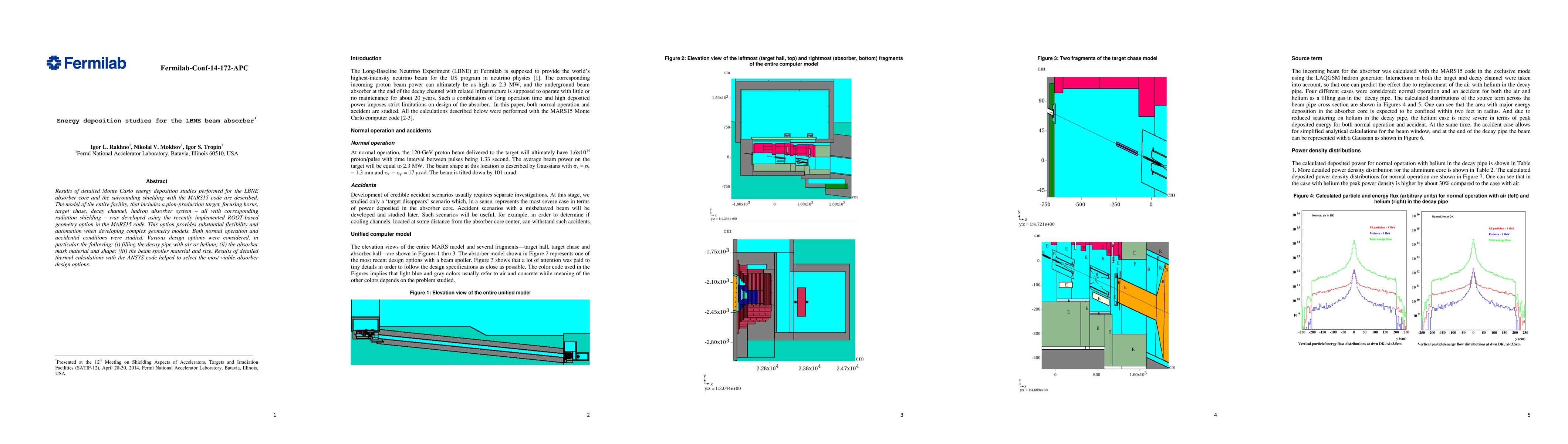 Results of detailed Monte Carlo energy deposition studies performed for the LBNE absorber core and the surrounding shielding with the MARS15 code are described. The model of the entire facility, that includes a pion-production target, focusing horns, target chase, decay channel, hadron absorber system -- all with corresponding radiation shielding -- was developed using the recently implemented ROOT-based geometry option in the MARS15 code. This option provides substantial flexibility and automation when developing complex geometry models. Both normal operation and accidental conditions were studied. Various design options were considered, in particular the following: (i) filling the decay pipe with air or helium; (ii) the absorber mask material and shape; (iii) the beam spoiler material and size. Results of detailed thermal calculations with the ANSYS code helped to select the most viable absorber design options.
