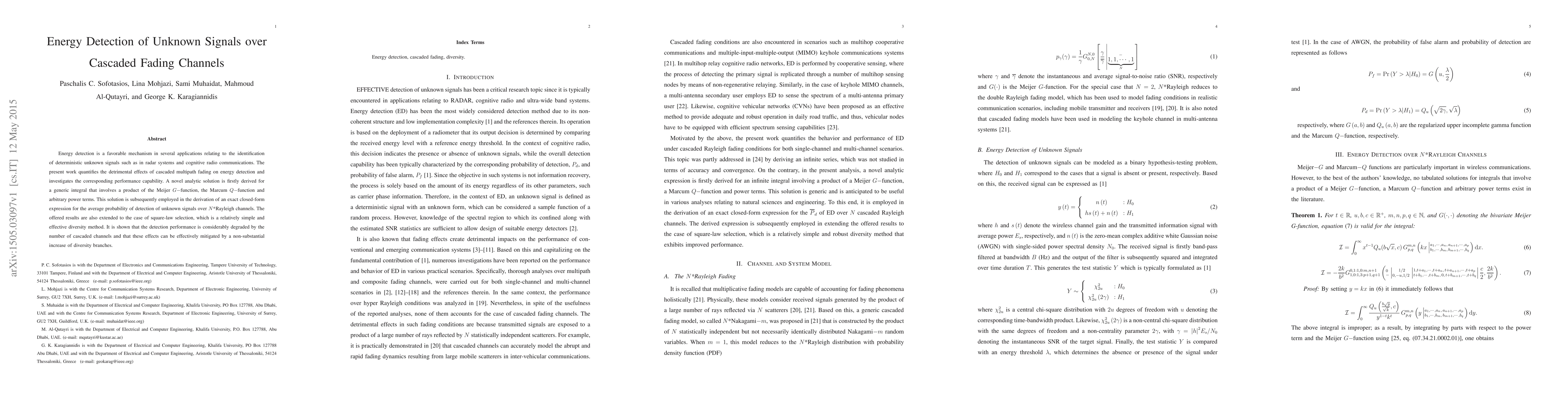 This research derives a novel analytic solution for energy detection of unknown signals in cascaded multipath fading channels, presenting a closed-form expression for detection probability. It shows that signal detection performance degrades with more channels but can be improved with slight diversity branch increases.