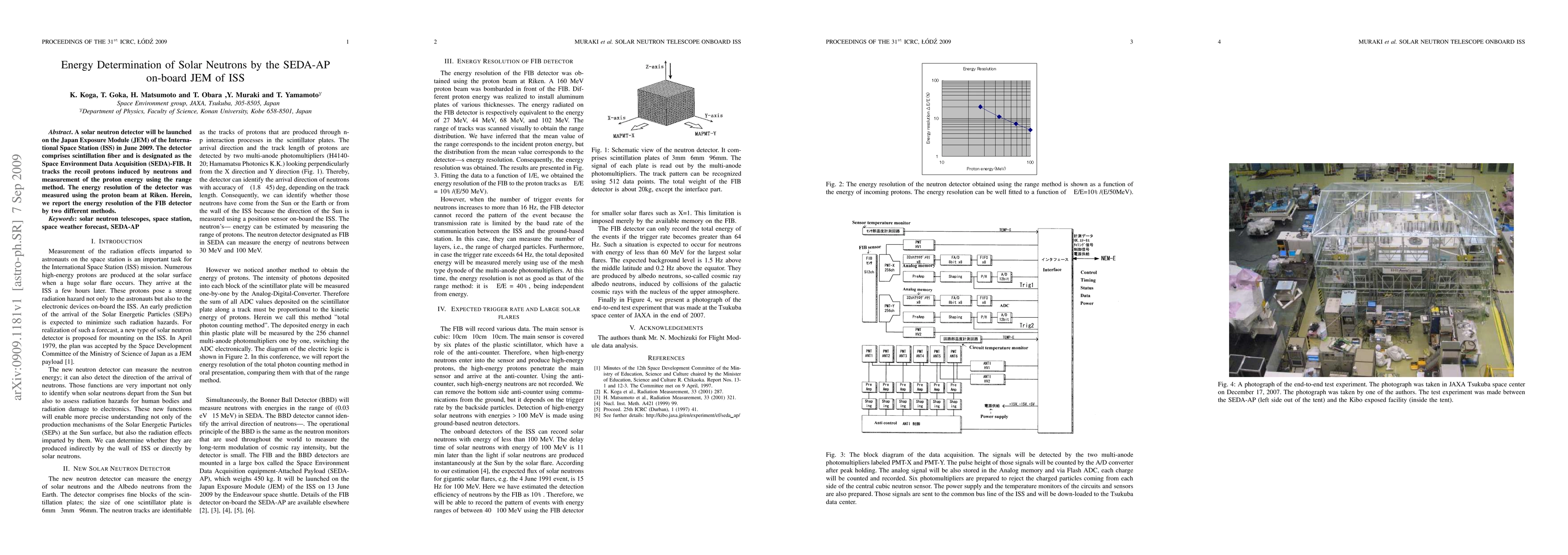 A solar neutron detector has been launched on the Japan Exposure Module (JEM) of the International Space Station (ISS) in August 4, 2009. The detector works satsifactory. The detector comprises scintillation fiber and is designated as the Space Environment Data Acquisition (SEDA)-FIB. It tracks the recoil protons induced by neutrons and measurement of the proton energy using the range method. The energy resolution of the detector was measured using the proton beam at Riken. Herein, we report the energy resolution of the FIB detector by two different methods.