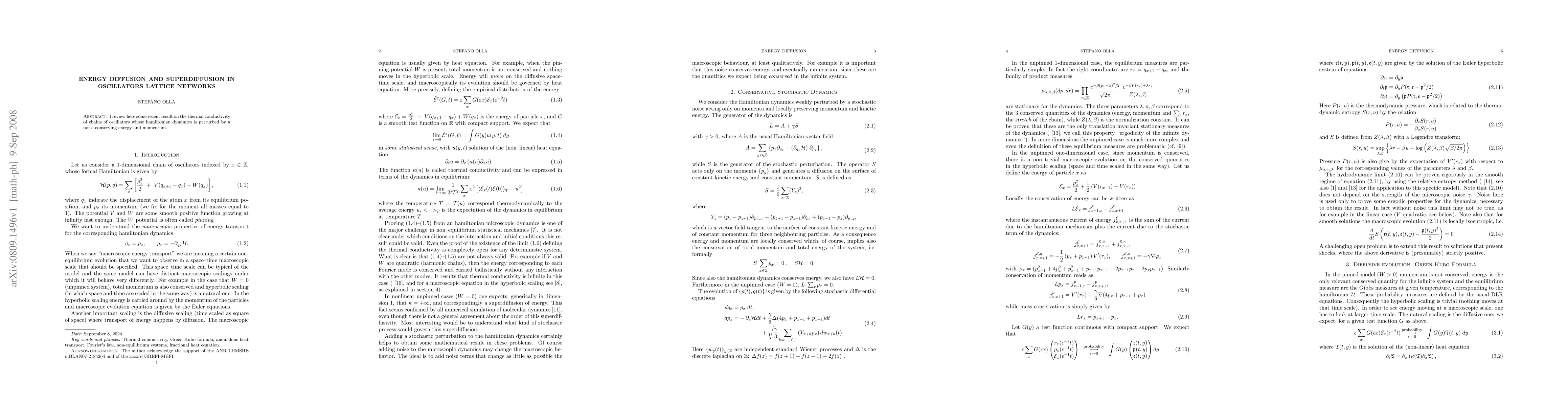 I review here some recent result on the thermal conductivity of chains of oscillators whose hamiltonian dynamics is perturbed by a noise conserving energy and momentum.