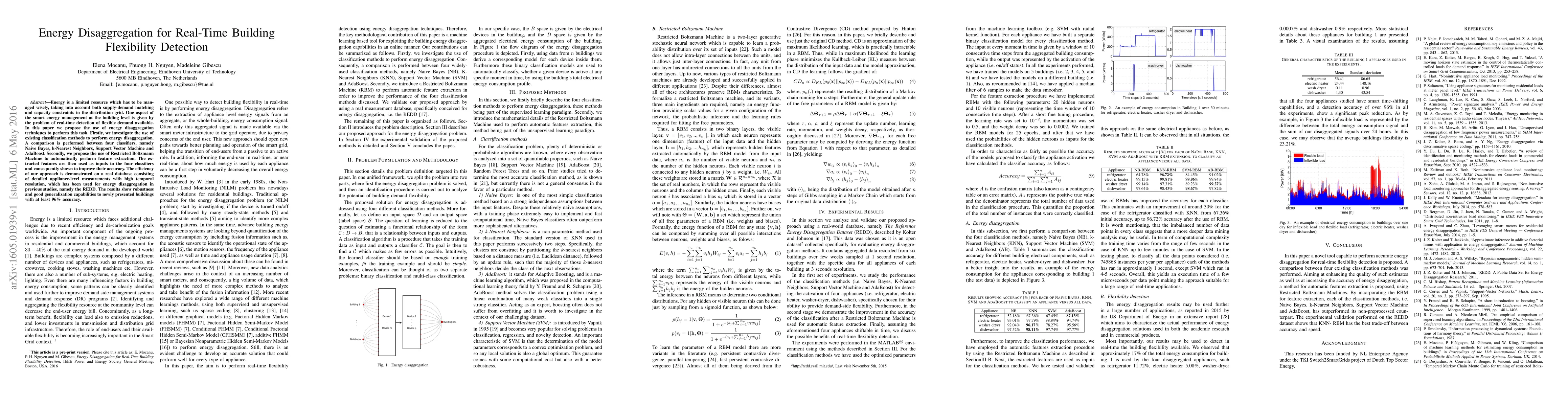 Energy is a limited resource which has to be managed wisely, taking into account both supply-demand matching and capacity constraints in the distribution grid. One aspect of the smart energy management at the building level is given by the problem of real-time detection of flexible demand available. In this paper we propose the use of energy disaggregation techniques to perform this task. Firstly, we investigate the use of existing classification methods to perform energy disaggregation. A comparison is performed between four classifiers, namely Naive Bayes, k-Nearest Neighbors, Support Vector Machine and AdaBoost. Secondly, we propose the use of Restricted Boltzmann Machine to automatically perform feature extraction. The extracted features are then used as inputs to the four classifiers and consequently shown to improve their accuracy. The efficiency of our approach is demonstrated on a real database consisting of detailed appliance-level measurements with high temporal resolution, which has been used for energy disaggregation in previous studies, namely the REDD. The results show robustness and good generalization capabilities to newly presented buildings with at least 96% accuracy.