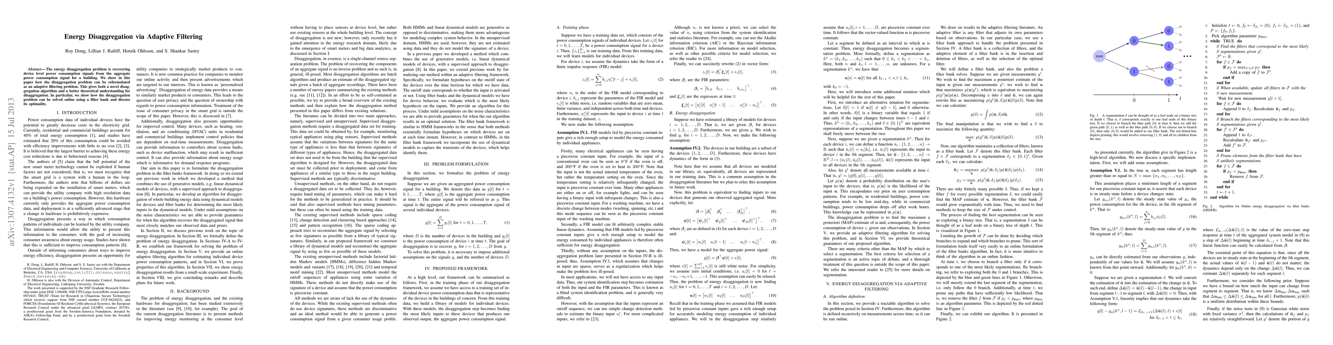 The energy disaggregation problem is recovering device level power consumption signals from the aggregate power consumption signal for a building. We show in this paper how the disaggregation problem can be reformulated as an adaptive filtering problem. This gives both a novel disaggregation algorithm and a better theoretical understanding for disaggregation. In particular, we show how the disaggregation problem can be solved online using a filter bank and discuss its optimality.
