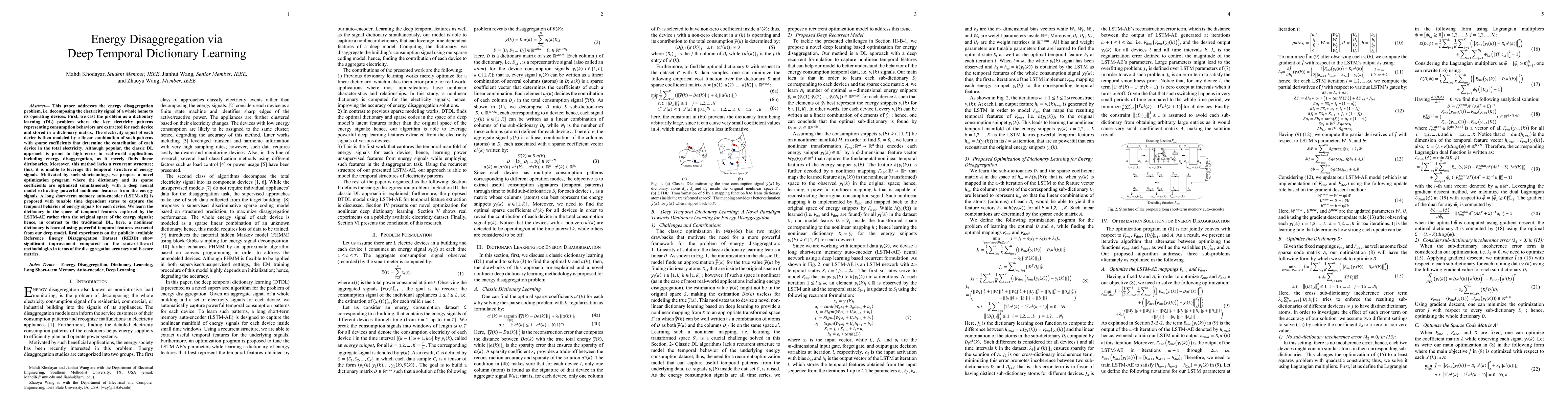 The research addresses energy disaggregation via deep temporal dictionary learning, using a long short-term memory auto-encoder (LSTM-AE) to extract nonlinear features from energy signals.