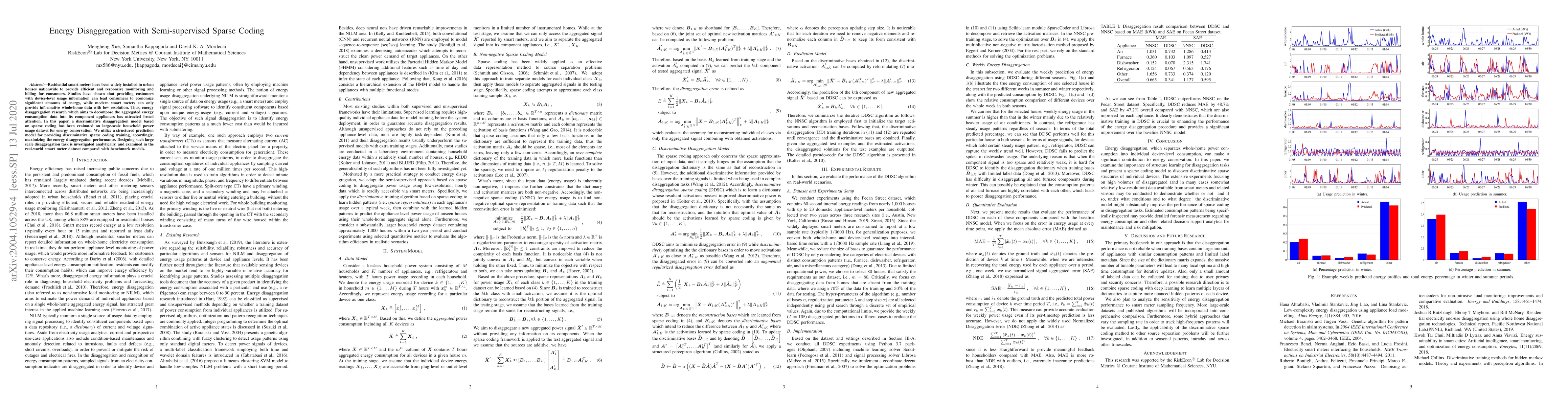 This paper proposes a discriminative energy disaggregation model using semi-supervised sparse coding to decompose household energy consumption data into appliance-level usage. The approach is evaluated on a large-scale smart meter dataset, demonstrating improved performance compared to benchmark models.