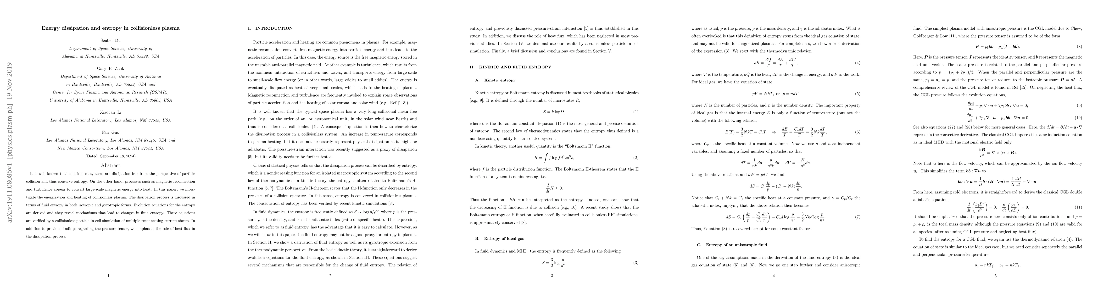 This paper investigates the apparent paradox of energy dissipation in collisionless plasmas, deriving evolution equations for fluid entropy that reveal mechanisms leading to changes in entropy. The study emphasizes the role of heat flux in the dissipation process and validates the findings through a particle-in-cell simulation of magnetic reconnection.
