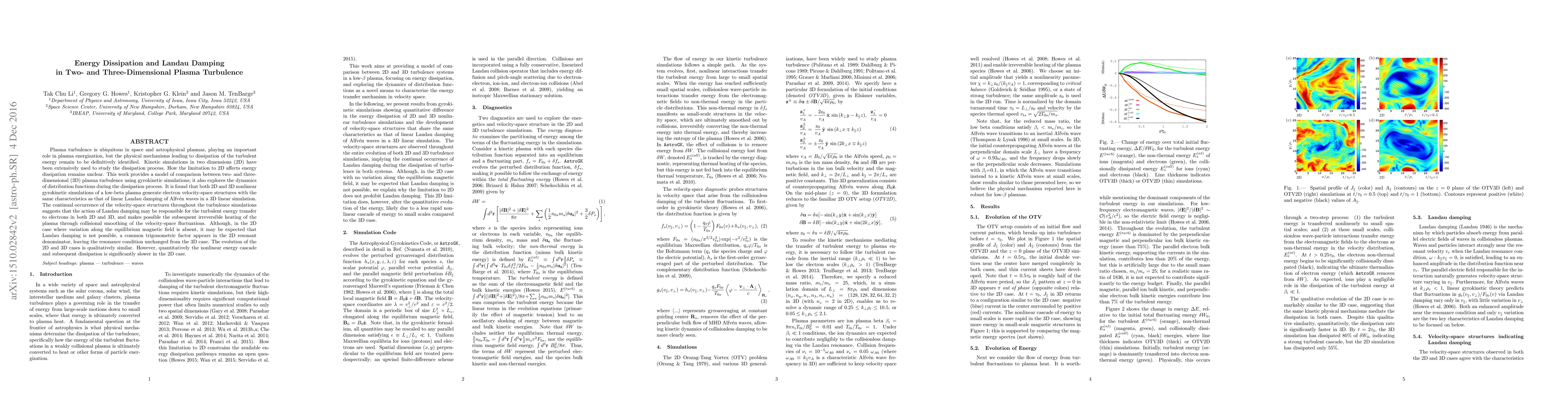This paper compares the energy dissipation mechanisms in two- and three-dimensional plasma turbulence using gyrokinetic simulations, finding that Landau damping is responsible for energy transfer to electrons in both dimensions. Despite 2D simulations lacking variation along the magnetic field, a common trigonometric factor maintains the resonance condition, though the energy cascade and dissipation are slower in 2D.
