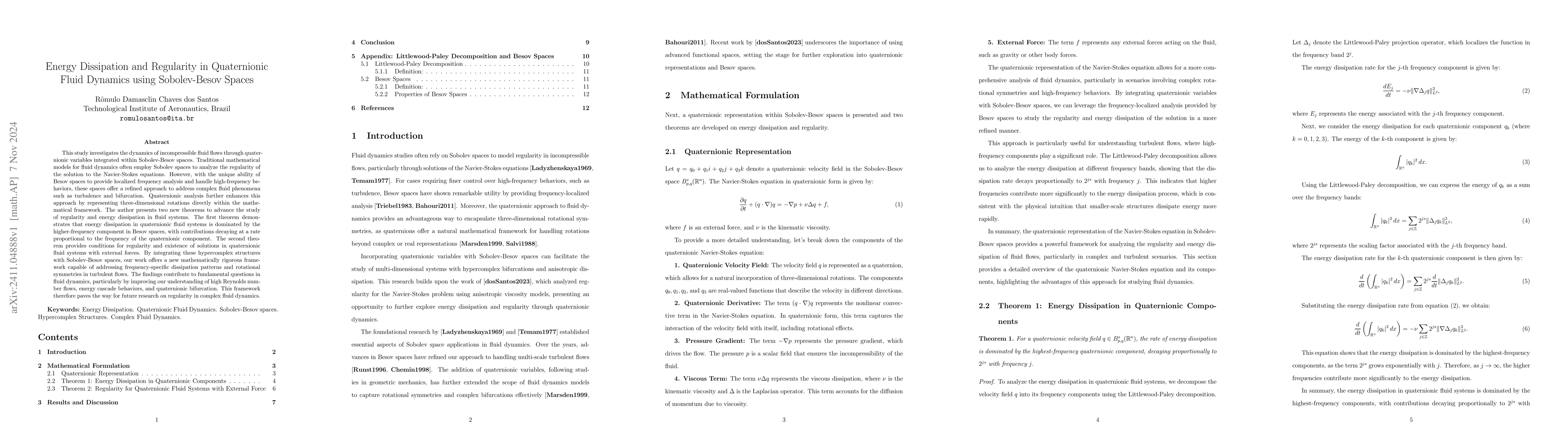 This paper explores the dynamics of incompressible fluid flows using quaternionic variables within Sobolev-Besov spaces, demonstrating that energy dissipation is primarily influenced by higher-frequency components. It introduces two theorems to enhance understanding of regularity and energy dissipation in fluid systems, paving the way for future research in complex fluid dynamics.
