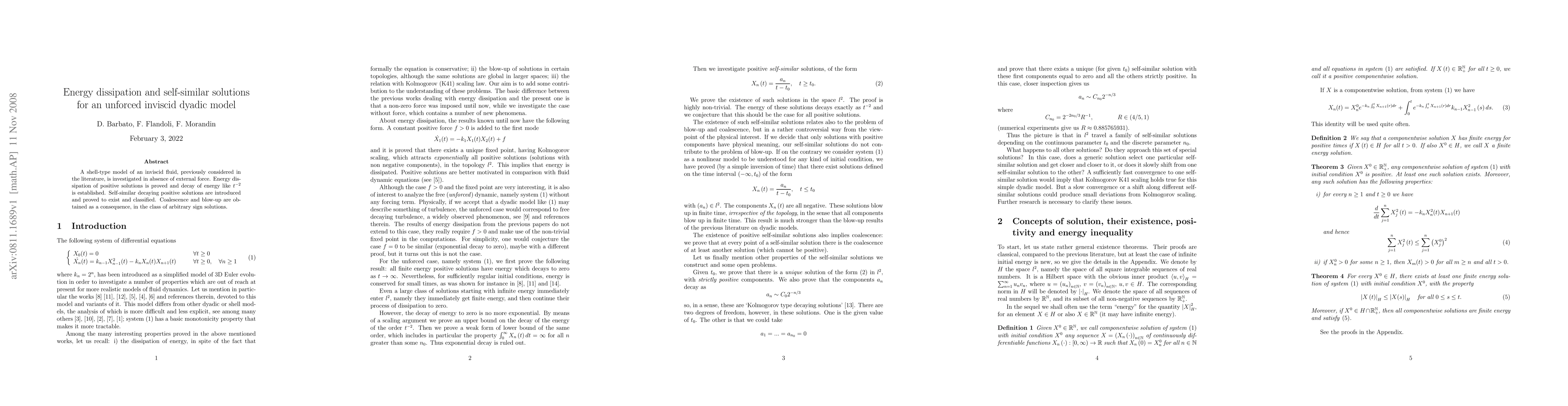 A shell-type model of an inviscid fluid, previously considered in the literature, is investigated in absence of external force. Energy dissipation of positive solutions is proved and decay of energy like $t^{-2}$ is established. Self-similar decaying positive solutions are introduced and proved to exist and classified. Coalescence and blow-up are obtained as a consequence, in the class of arbitrary sign solutions.