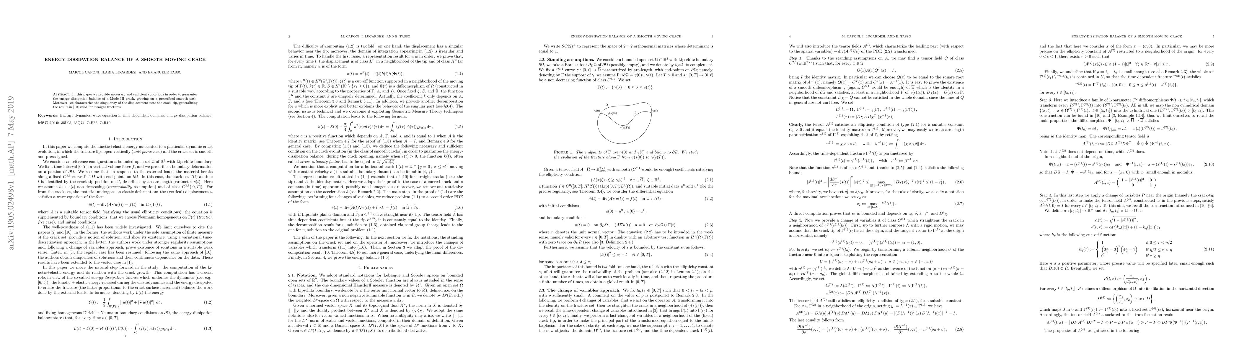 A study provides necessary conditions for energy-dissipation balance in a smooth moving Mode III crack, generalizing previous results for straight fractures. It characterizes the displacement singularity near the crack tip.