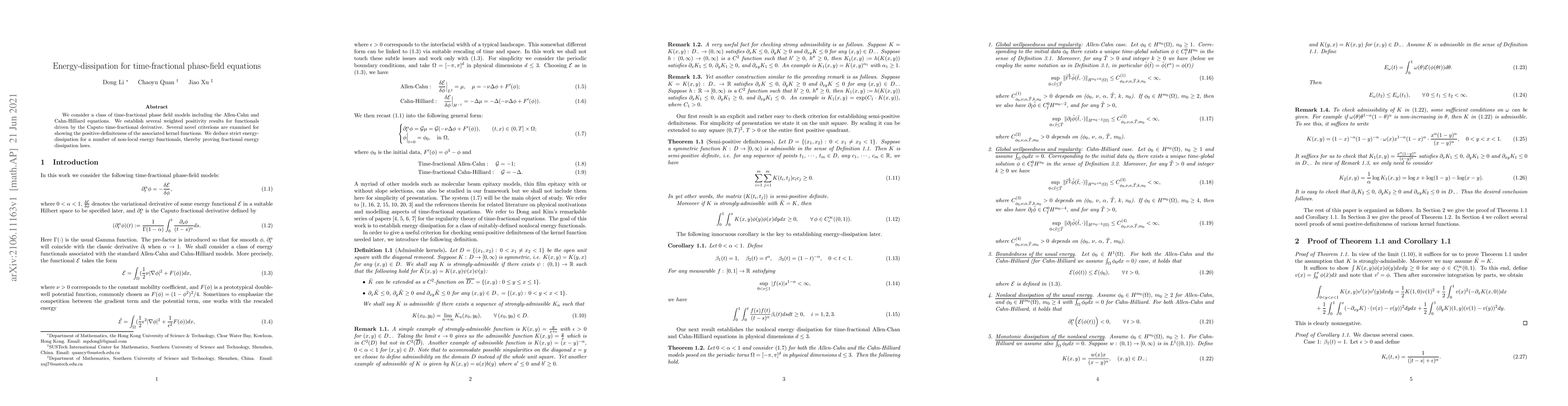 We consider a class of time-fractional phase field models including the Allen-Cahn and Cahn-Hilliard equations. We establish several weighted positivity results for functionals driven by the Caputo time-fractional derivative. Several novel criterions are examined for showing the positive-definiteness of the associated kernel functions. We deduce strict energy-dissipation for a number of non-local energy functionals, thereby proving fractional energy dissipation laws.