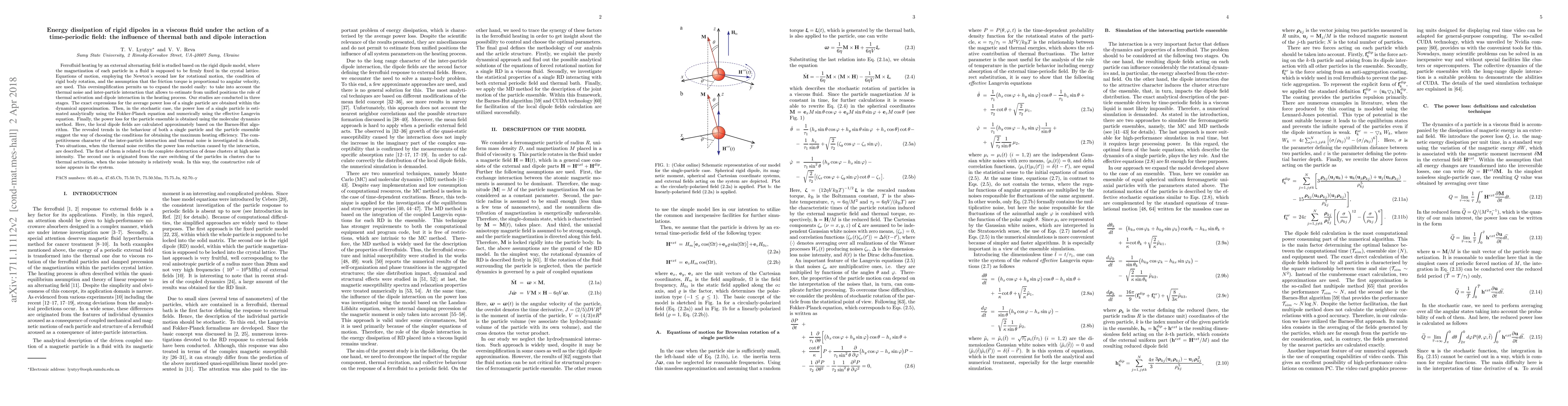This paper investigates the energy dissipation of rigid dipoles in a viscous fluid under a time-periodic field, focusing on the influence of thermal bath and dipole interaction. It uses a rigid dipole model to study ferrofluid heating, deriving expressions for average power loss and analyzing the effects of thermal noise and inter-particle interactions using analytical and numerical methods.
