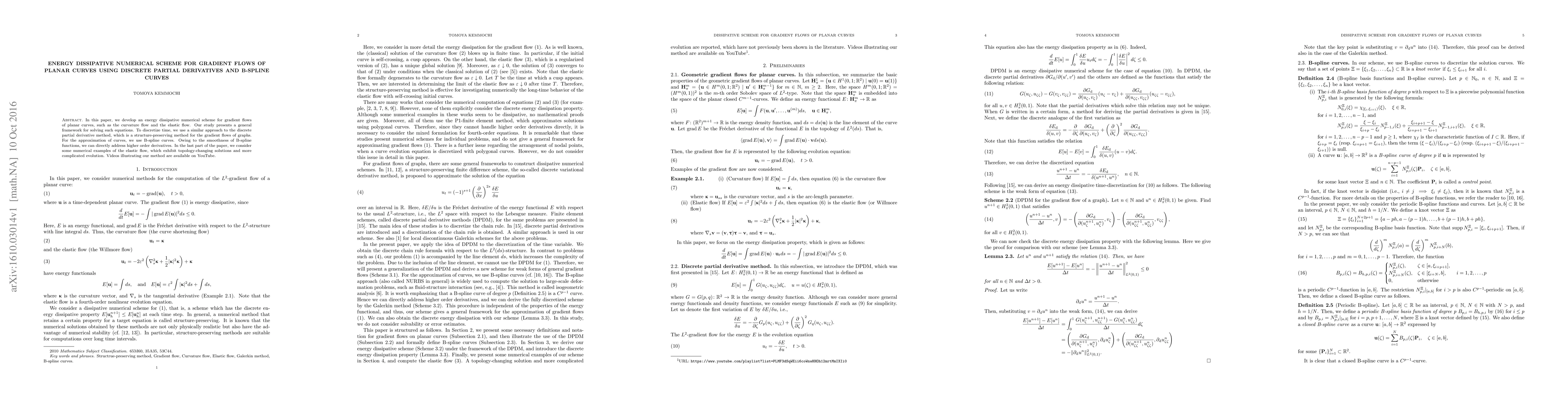 This paper introduces an energy dissipative numerical scheme for gradient flows of planar curves using discrete partial derivatives and B-spline curves. The method preserves structural properties and handles higher-order derivatives efficiently, demonstrated through numerical examples of elastic flow with complex evolution.
