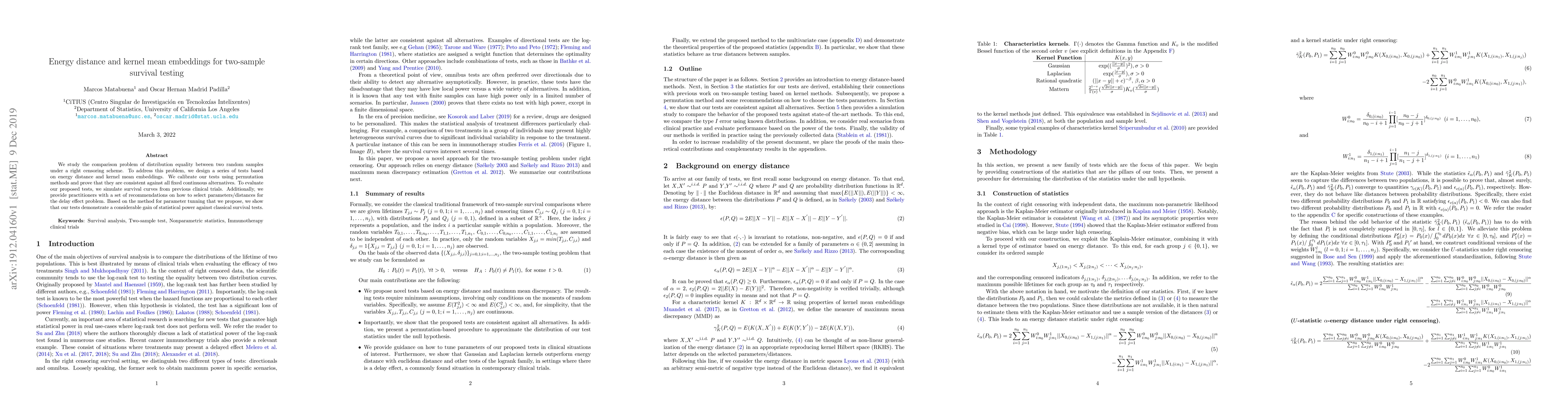 We study the comparison problem of distribution equality between two random samples under a right censoring scheme. To address this problem, we design a series of tests based on energy distance and kernel mean embeddings. We calibrate our tests using permutation methods and prove that they are consistent against all fixed continuous alternatives. To evaluate our proposed tests, we simulate survival curves from previous clinical trials. Additionally, we provide practitioners with a set of recommendations on how to select parameters/distances for the delay effect problem. Based on the method for parameter tunning that we propose, we show that our tests demonstrate a considerable gain of statistical power against classical survival tests.