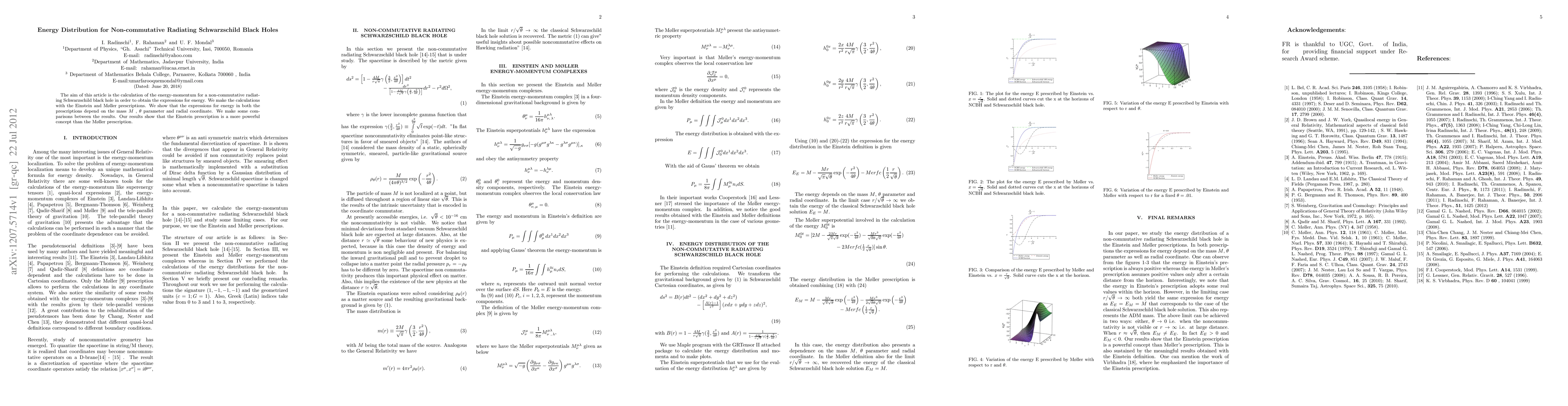 Researchers calculated energy-momentum for a non-commutative radiating Schwarzschild black hole using Einstein and Moller prescriptions, finding the Einstein method to be more powerful in obtaining energy expressions.