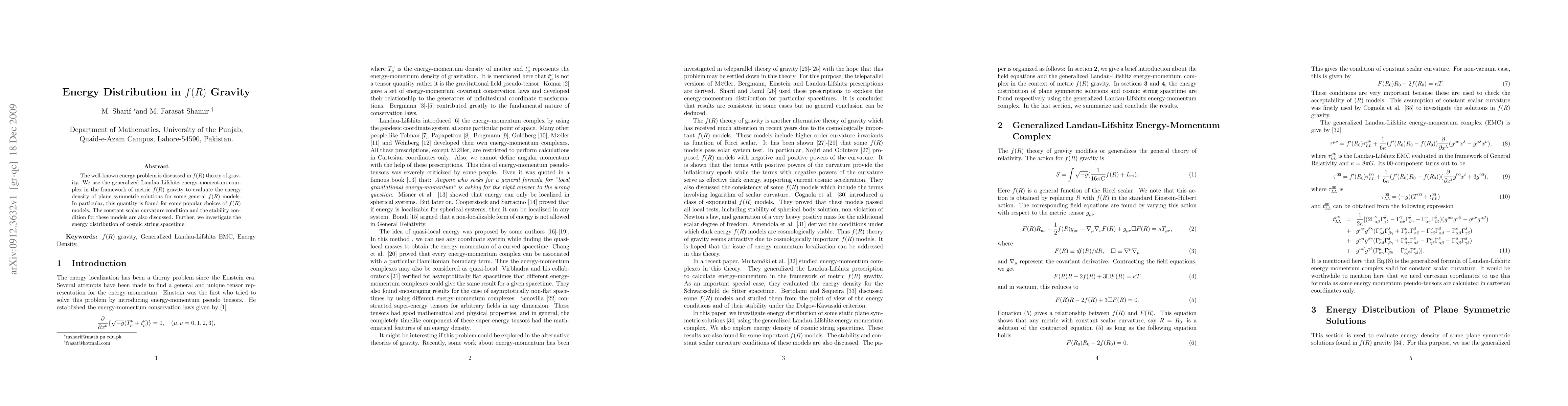 The well-known energy problem is discussed in f(R) theory of gravity. We use the generalized Landau-Lifshitz energy-momentum complex in the framework of metric f(R) gravity to evaluate the energy density of plane symmetric solutions for some general f(R) models. In particular, this quantity is found for some popular choices of f(R) models. The constant scalar curvature condition and the stability condition for these models are also discussed. Further, we investigate the energy distribution of cosmic string spacetime.