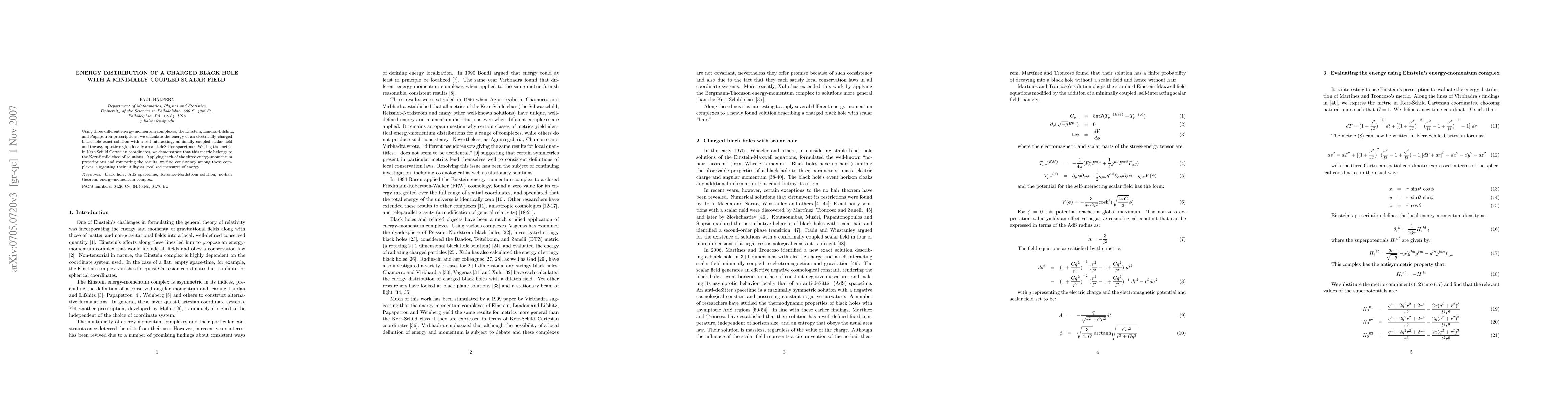 This paper calculates the energy of a charged black hole with a minimally coupled scalar field using three energy-momentum complexes—Einstein, Landau-Lifshitz, and Papapetrou. It shows consistency among these methods, indicating their effectiveness as localized energy measures.